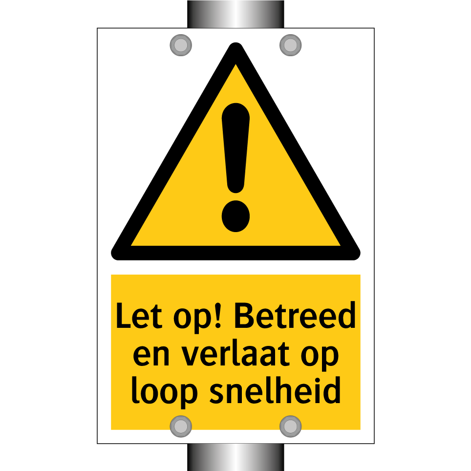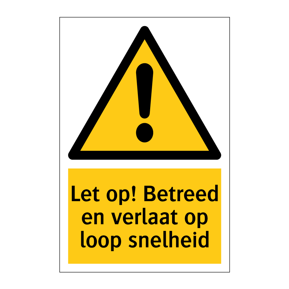 Waarschuwingsbord met de tekst Let op! Betreed en verlaat op loop snelheid
