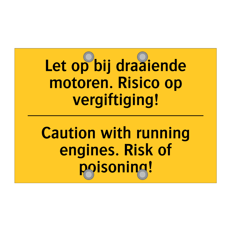 Waarschuwingsbord met de tekst Let op bij draaiende motoren. Risico op vergiftiging! / Caution with running engines. Risk of poisoning!