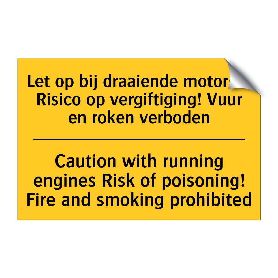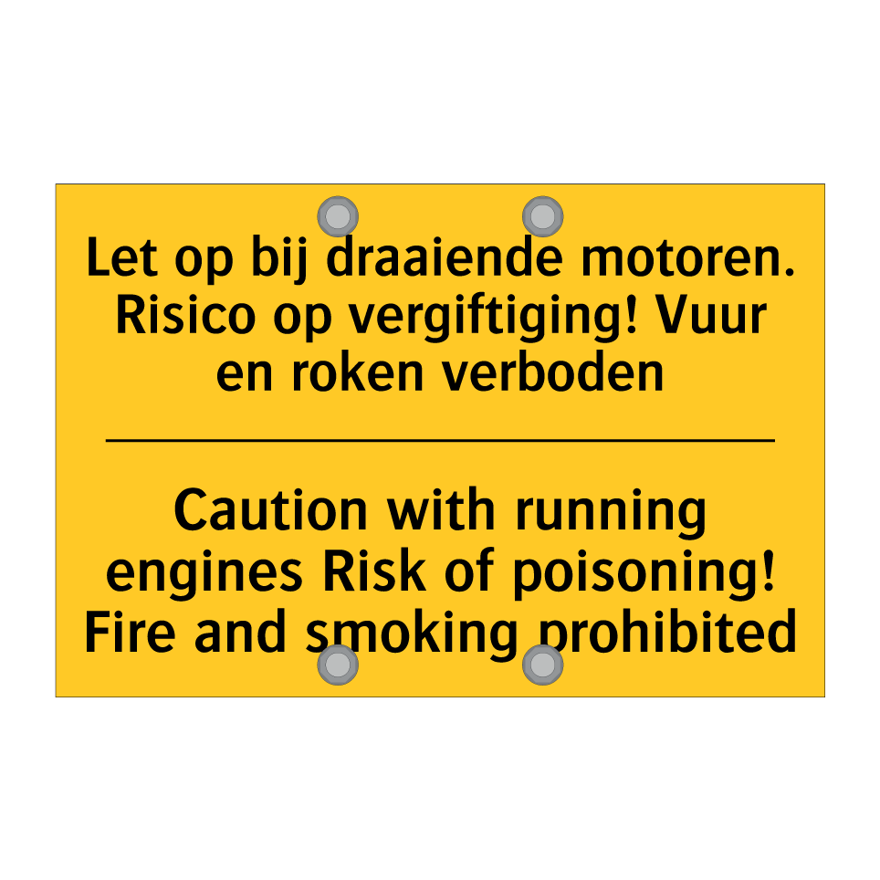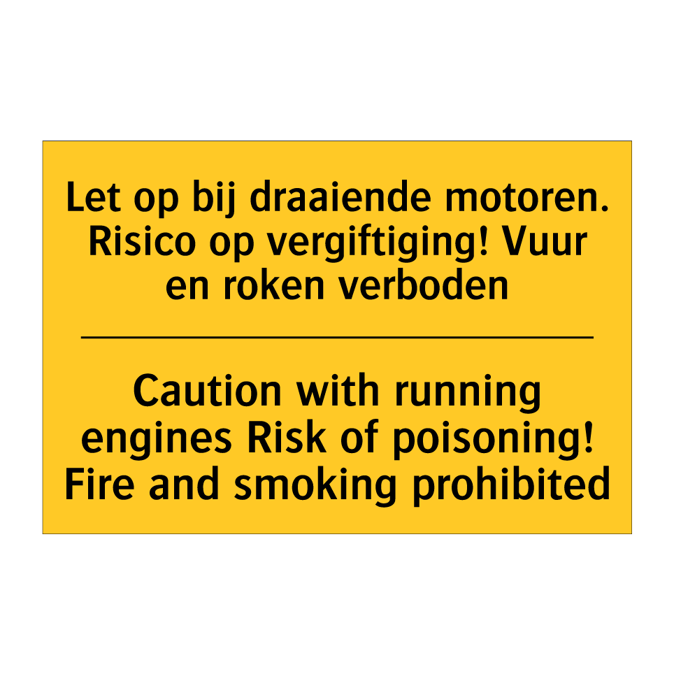 Waarschuwingsbord met de tekst Let op bij draaiende motoren. Risico op vergiftiging! Vuur en roken verboden / Caution with running engines Risk of poisoning! Fire and smoking prohibited