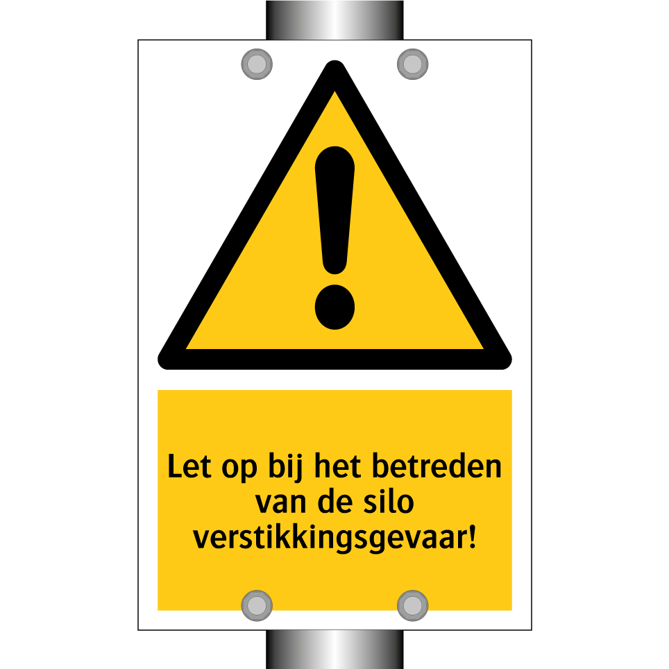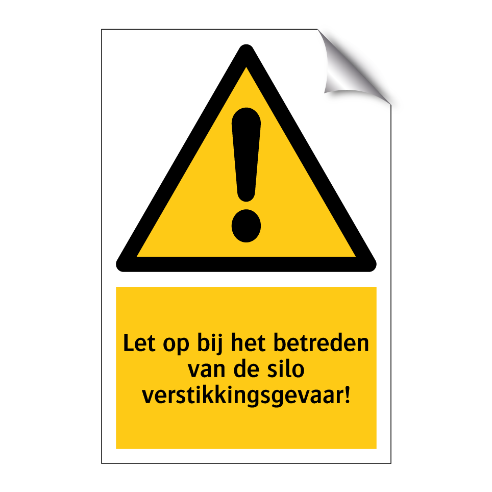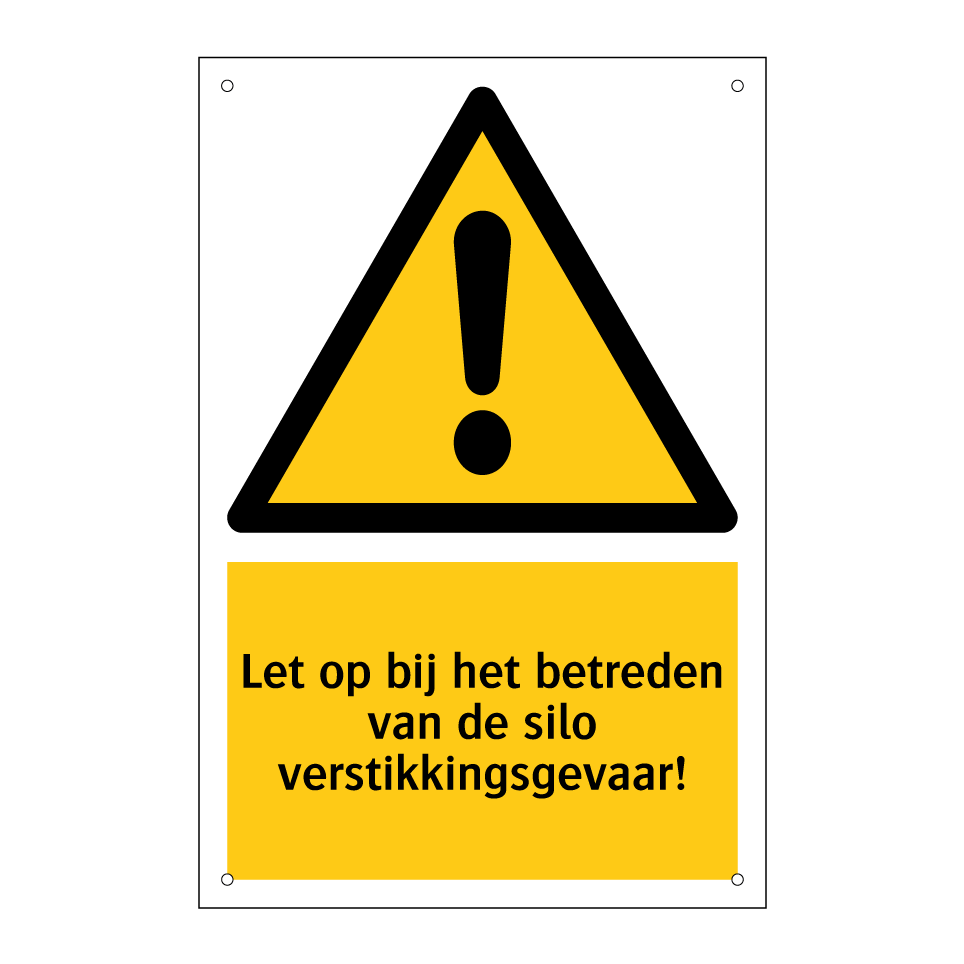 Deze waarschuwingsbord is essentieel voor de veiligheid in en rondom silo's. Het waarschuwt werknemers en bezoekers voor het gevaar van verstikking bij het betreden van de silo. Plaats deze bord op goed zichtbare locaties zoals ingangen, toegangswegen en nabij de silo zelf om ervoor te zorgen dat iedereen op de hoogte is van de potentiële risico's. Dit waarschuwingsbord helpt ongelukken te voorkomen en bevordert een veilige werkomgeving. Ideaal voor gebruik in industriële omgevingen, landbouwbedrijven en andere locaties waar silo's aanwezig zijn. Zorg voor de veiligheid van uw personeel met deze duidelijke en effectieve waarschuwing.