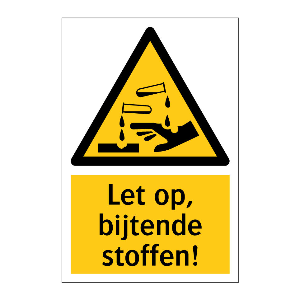Waarschuwingsbord met de tekst Let op, bijtende stoffen!