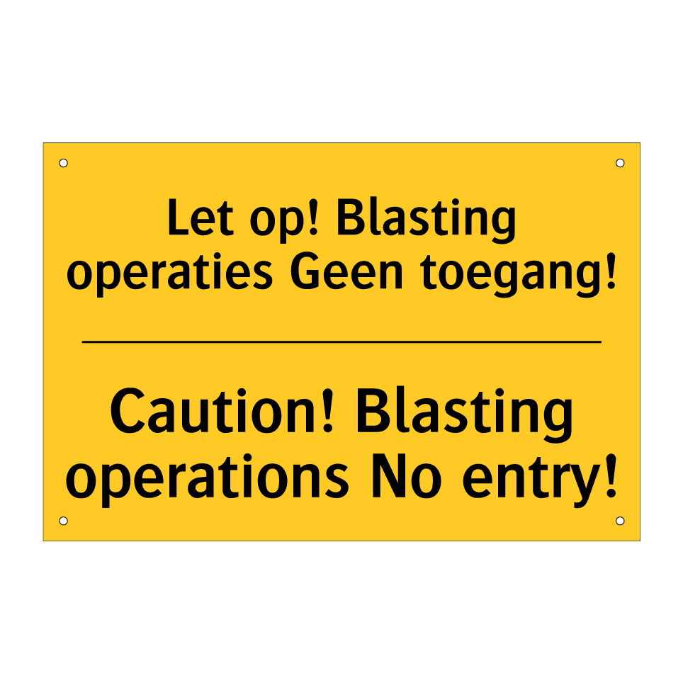 Waarschuwingsbord met de tekst Let op! Blasting operaties Geen toegang! / Caution! Blasting operations No entry!