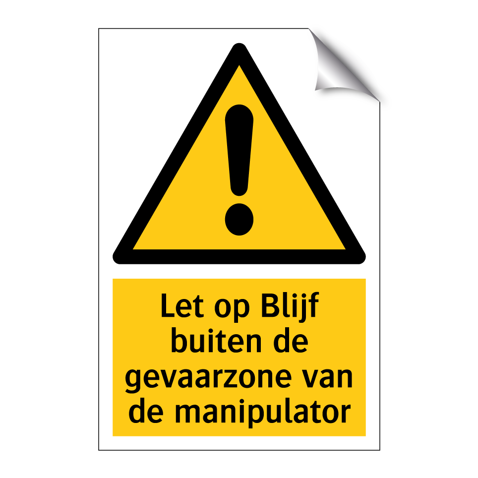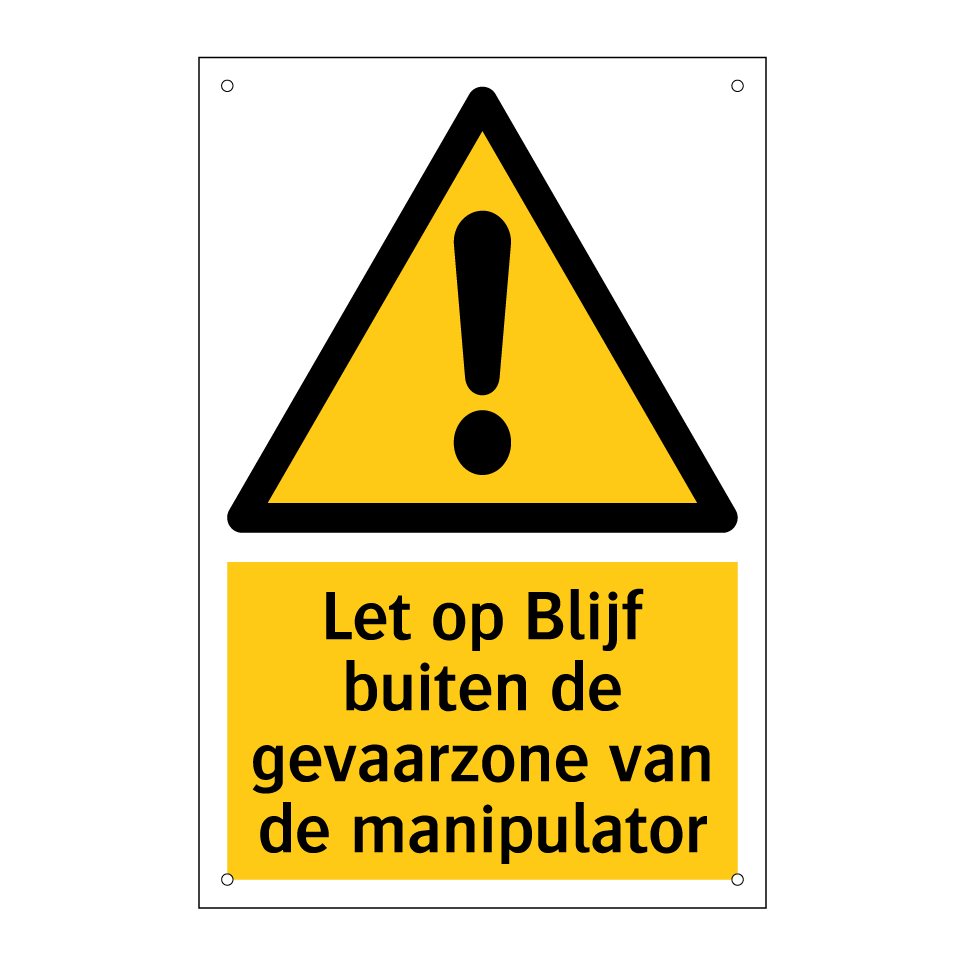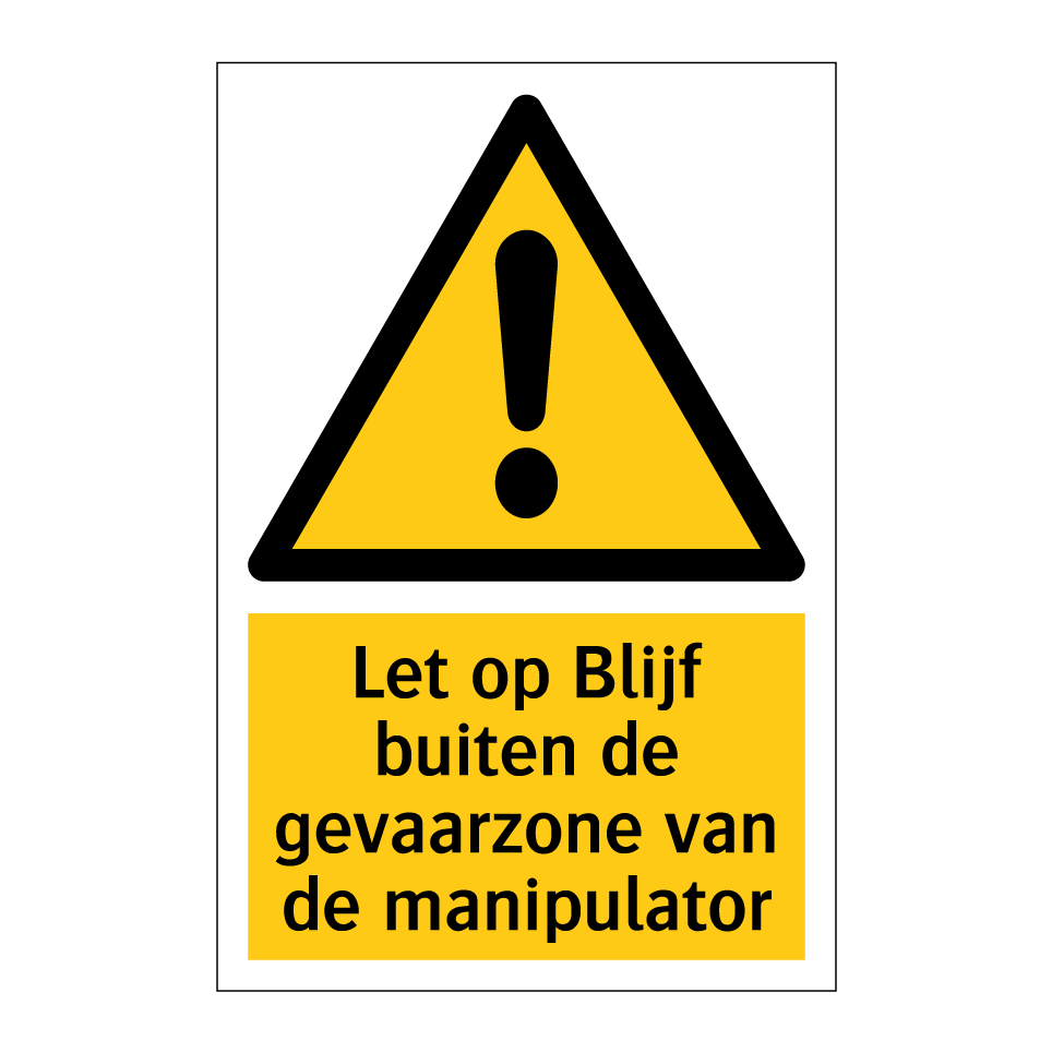 Waarschuwingsbord met de tekst Let op Blijf buiten de gevaarzone van de manipulator