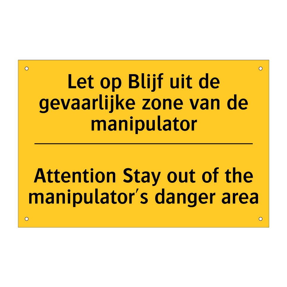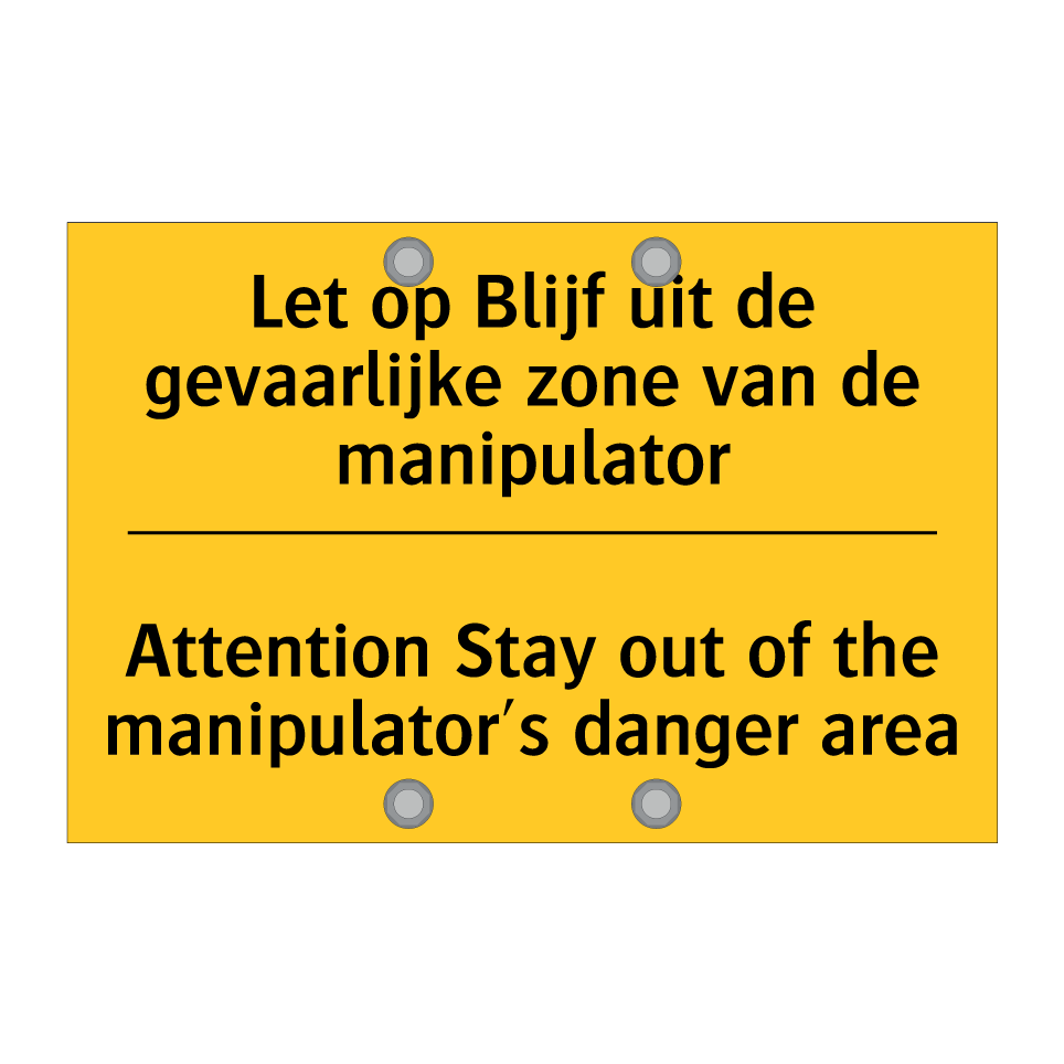 Waarschuwingsbord met de tekst Let op Blijf uit de gevaarlijke zone van de manipulator / Attention Stay out of the manipulator's danger area