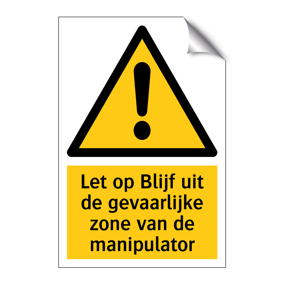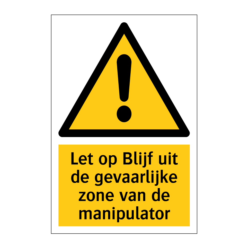 Waarschuwingsbord met de tekst Let op Blijf uit de gevaarlijke zone van de manipulator