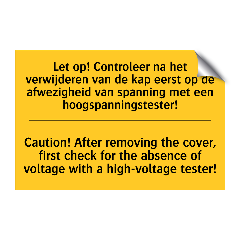 Waarschuwingsbord met de tekst Let op! Controleer na het verwijderen van de kap eerst op de afwezigheid van spanning met een hoogspanningstester! / Caution! After removing the cover, first check for the absence of voltage with a high-voltage tester!