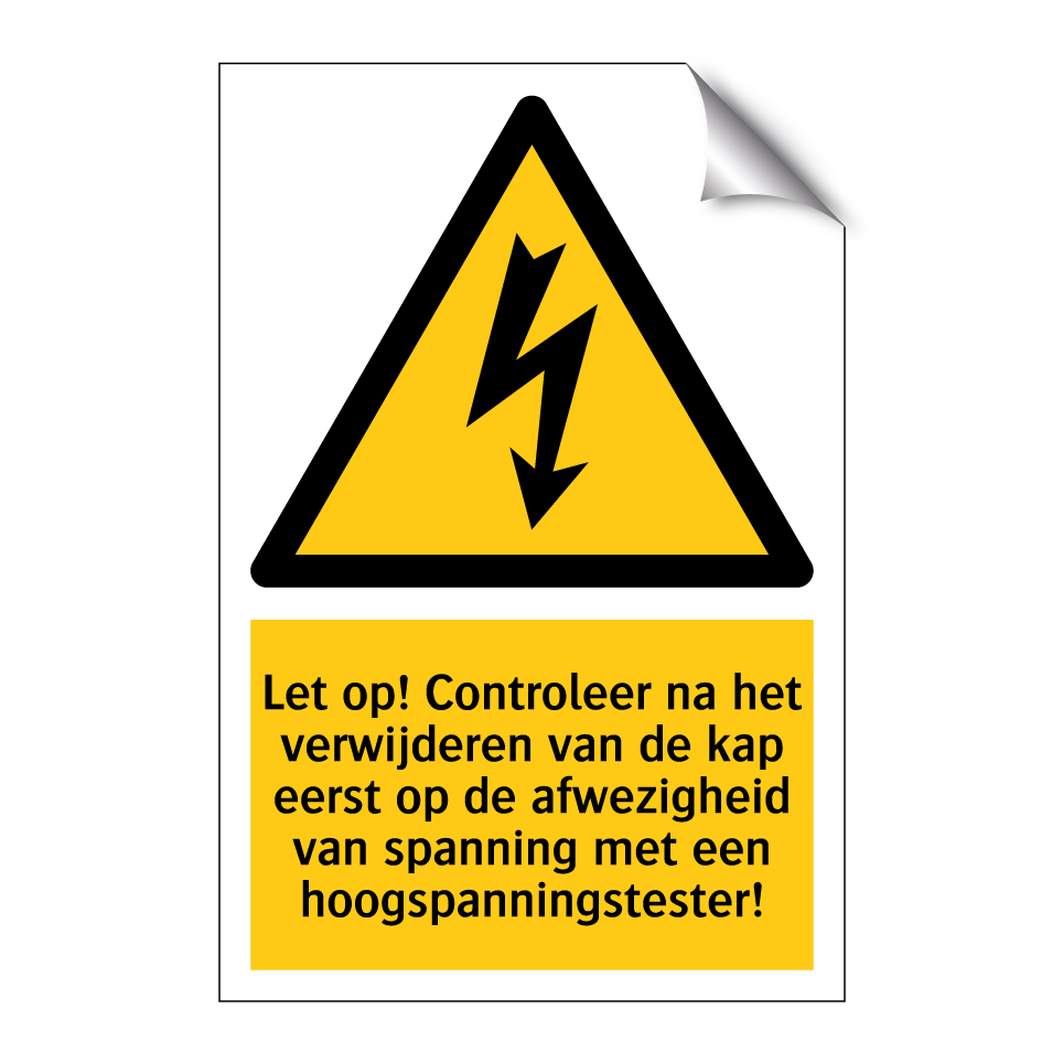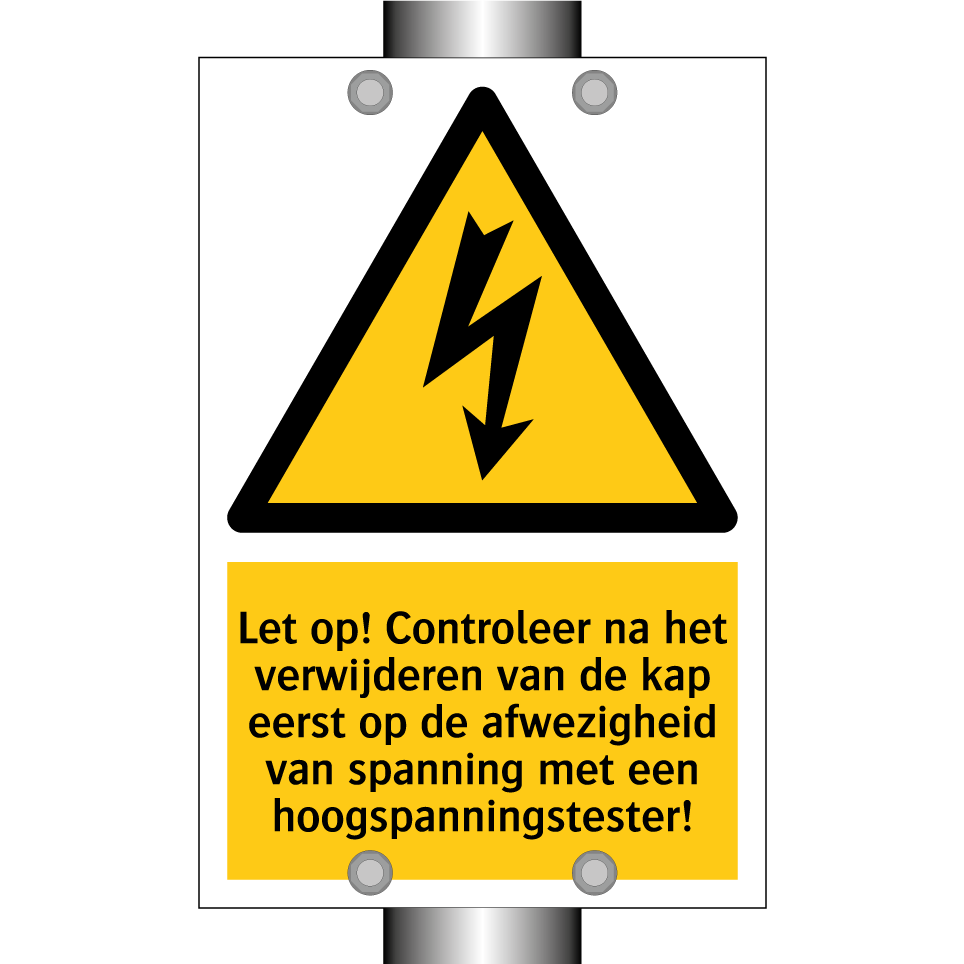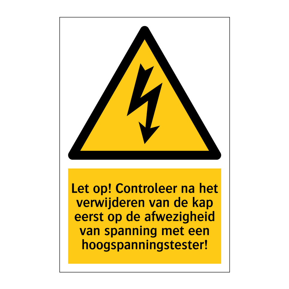 Waarschuwingsbord met de tekst Let op! Controleer na het verwijderen van de kap eerst op de afwezigheid van spanning met een hoogspanningstester!