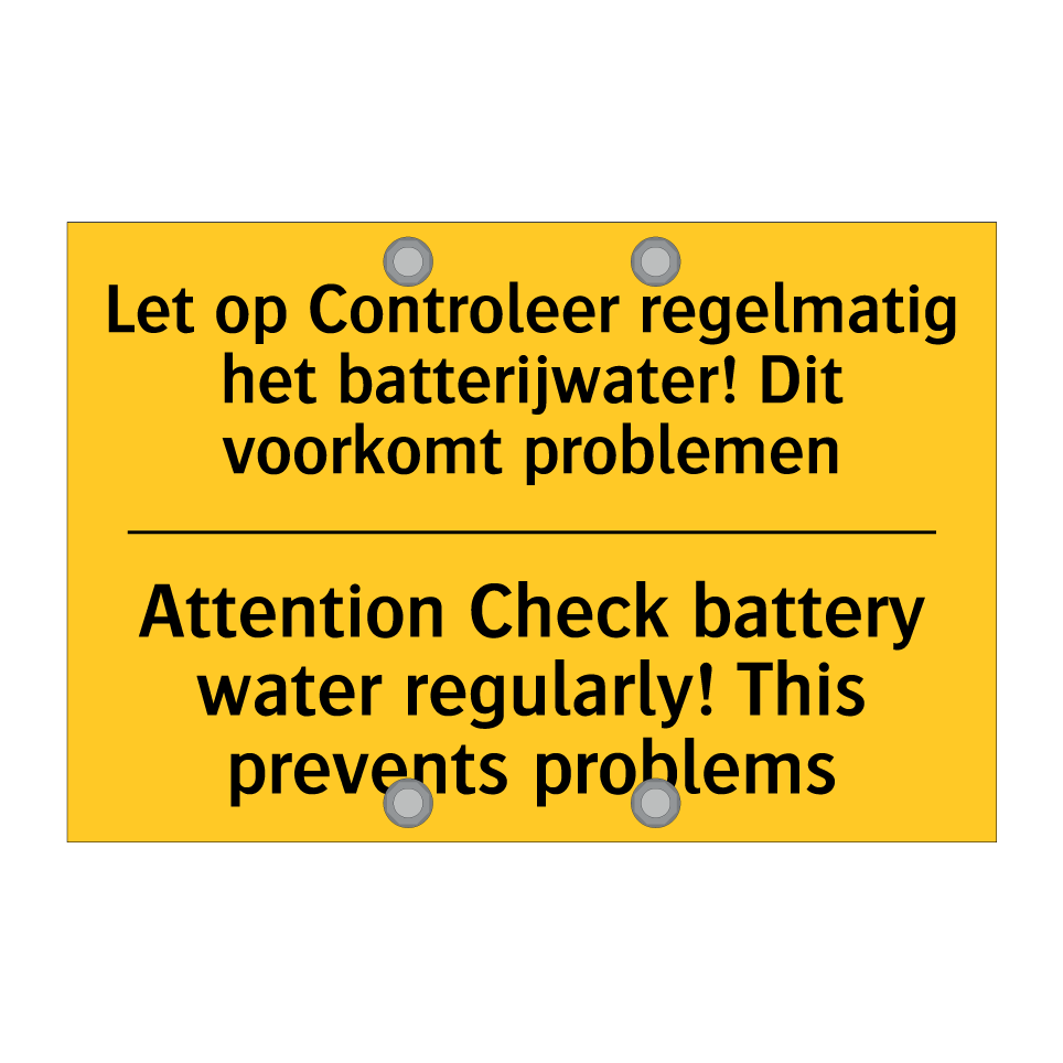 Waarschuwingsbord met de tekst Let op Controleer regelmatig het batterijwater! Dit voorkomt problemen / Attention Check battery water regularly! This prevents problems