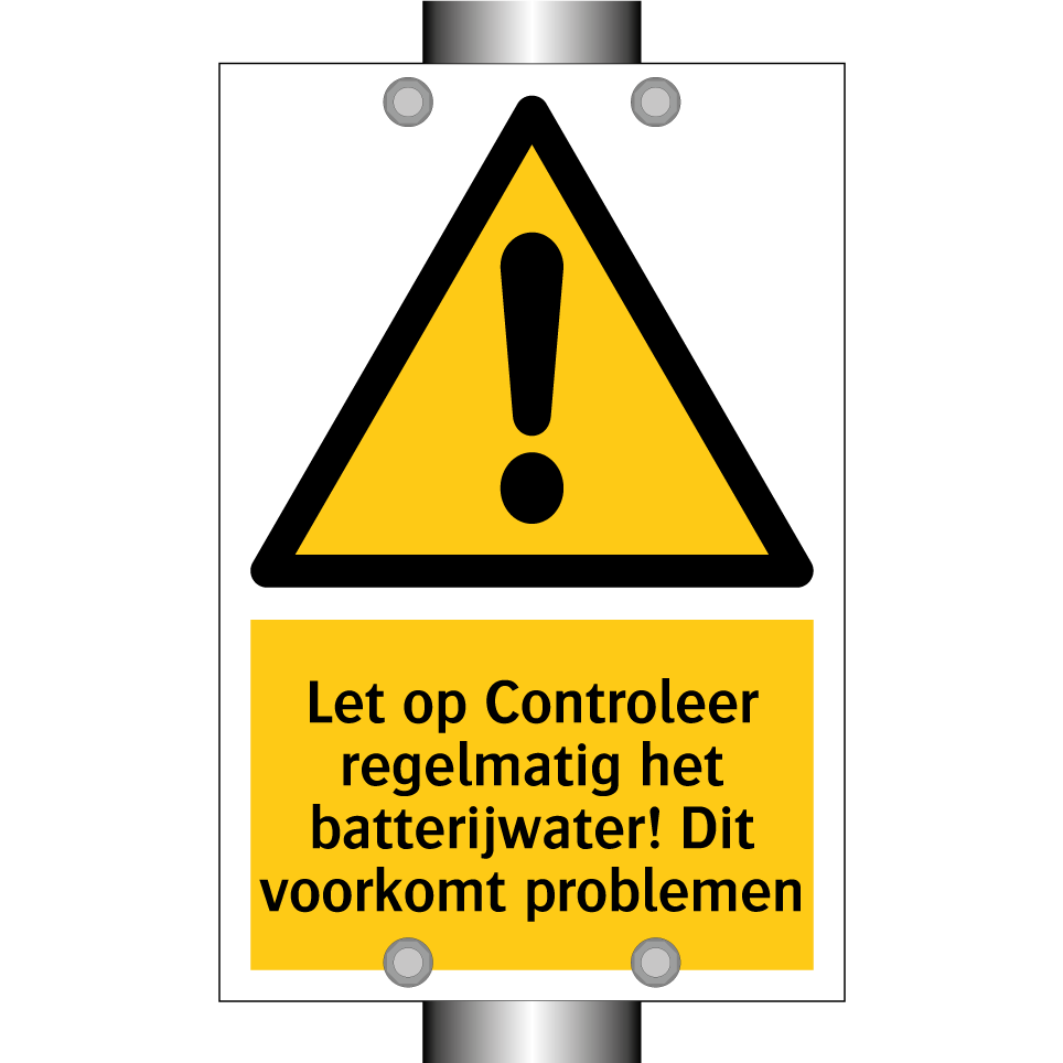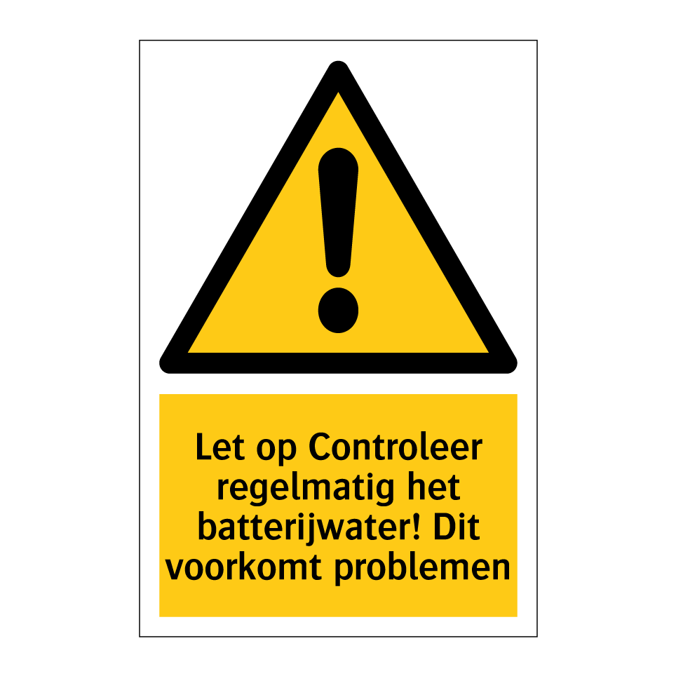Waarschuwingsbord met de tekst Let op Controleer regelmatig het batterijwater! Dit voorkomt problemen