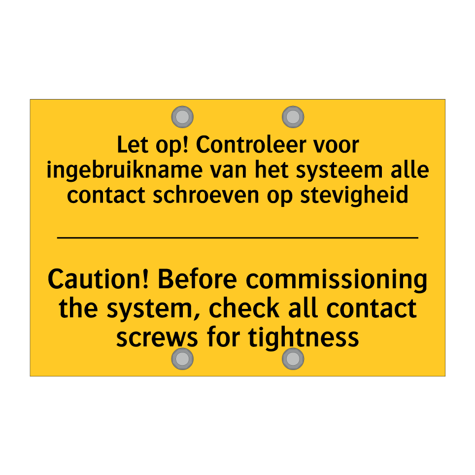 Waarschuwingsbord met de tekst Let op! Controleer voor ingebruikname van het systeem alle contact schroeven op stevigheid / Caution! Before commissioning the system, check all contact screws for tightness
