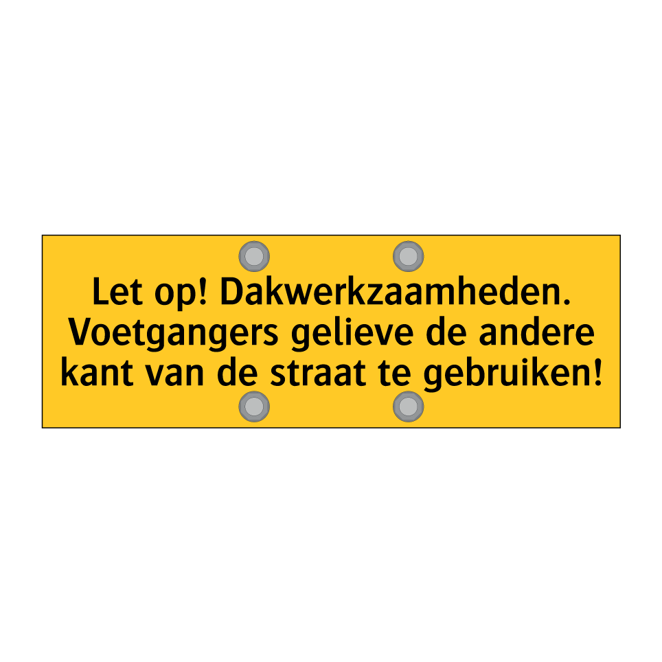Deze waarschuwingsbord is essentieel voor het waarborgen van de veiligheid van voetgangers in gebieden waar dakwerkzaamheden plaatsvinden. Plaats deze opvallende gele bord met zwarte tekst op strategische locaties zoals trottoirs, ingangen van gebouwen, of nabij bouwplaatsen om voorbijgangers te waarschuwen en hen te begeleiden naar een veiligere route. Door het gebruik van deze waarschuwingsbord kunnen ongelukken worden voorkomen en wordt de aandacht van voetgangers effectief getrokken. Ideaal voor gebruik in drukke stedelijke omgevingen, bouwterreinen, en andere plekken waar dakreparaties of onderhoudswerkzaamheden plaatsvinden. Zorg voor een veilige omgeving door deze duidelijke en goed zichtbare waarschuwingsbord te plaatsen.