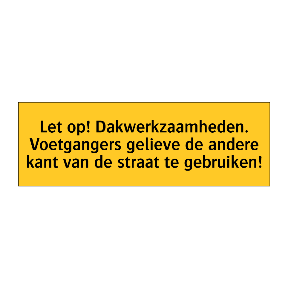 Waarschuwingsbord met de tekst Let op! Dakwerkzaamheden. Voetgangers gelieve de andere kant van de straat te gebruiken!