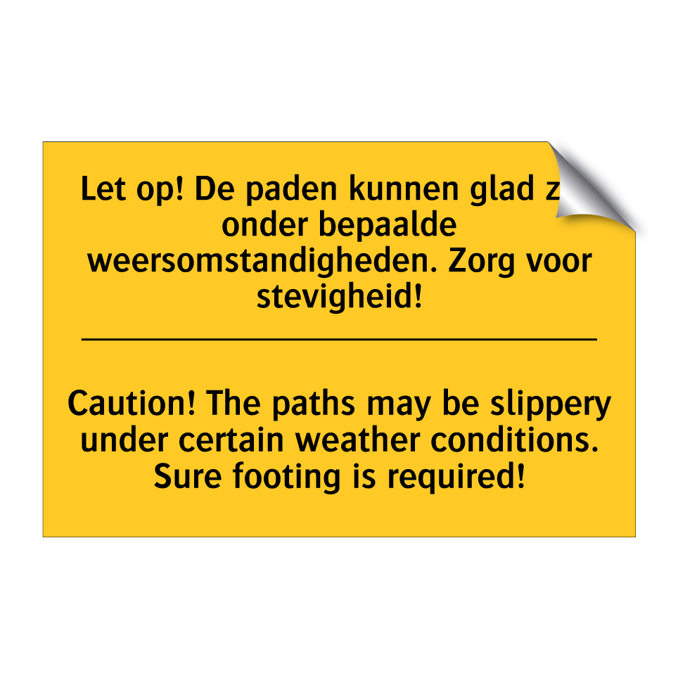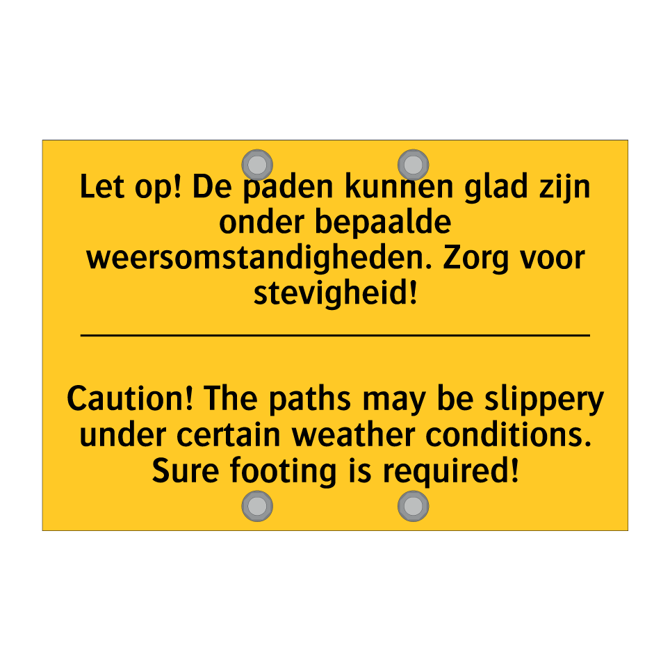 Dit waarschuwingsbord met een gele achtergrond en zwarte tekst is ideaal voor het aangeven van potentieel gevaarlijke situaties. De tekst is zowel in het Nederlands als in het Engels, wat het bord geschikt maakt voor internationale locaties en bezoekers. dit bordje waarschuwt voor gladde paden onder bepaalde weersomstandigheden en benadrukt het belang van een stevige voet. Plaats dit waarschuwingsbord bij ingangen, wandelpaden, trappen of andere gebieden waar mensen extra voorzichtig moeten zijn. Het is perfect voor parken, openbare ruimtes, bedrijfsterreinen en andere plekken waar veiligheid voorop staat. Met dit bordje verhoog je de bewustwording en voorkom je ongelukken.