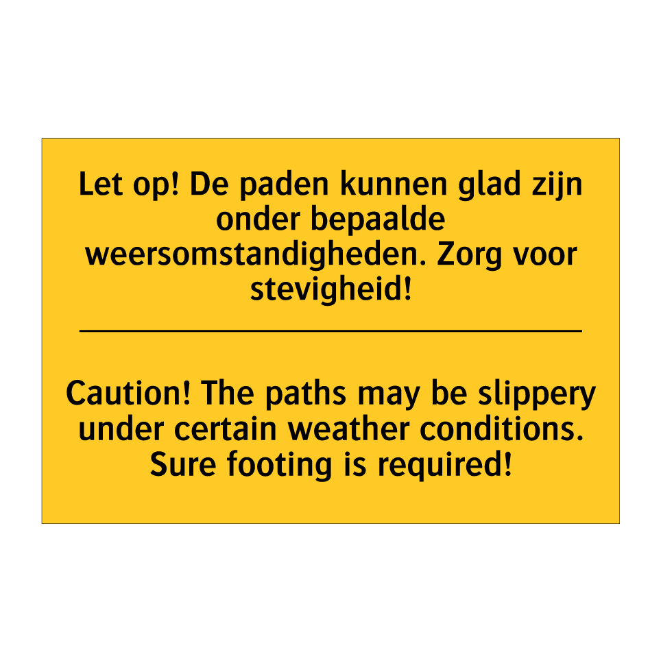 Waarschuwingsbord met de tekst Let op! De paden kunnen glad zijn onder bepaalde weersomstandigheden. Zorg voor stevigheid! / Caution! The paths may be slippery under certain weather conditions. Sure footing is required!