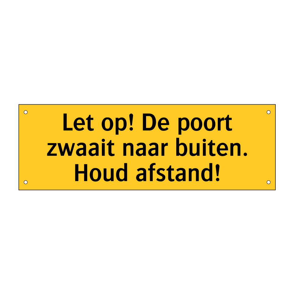 Waarschuwingsbord met de tekst Let op! De poort zwaait naar buiten. Houd afstand!