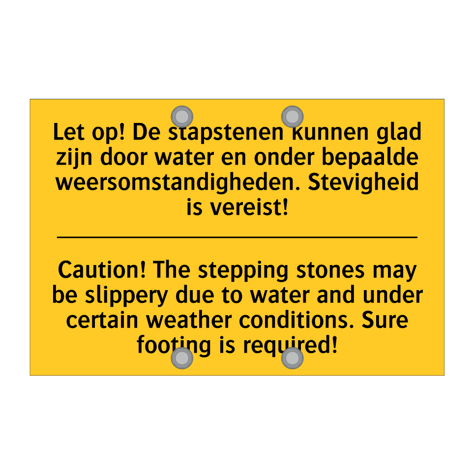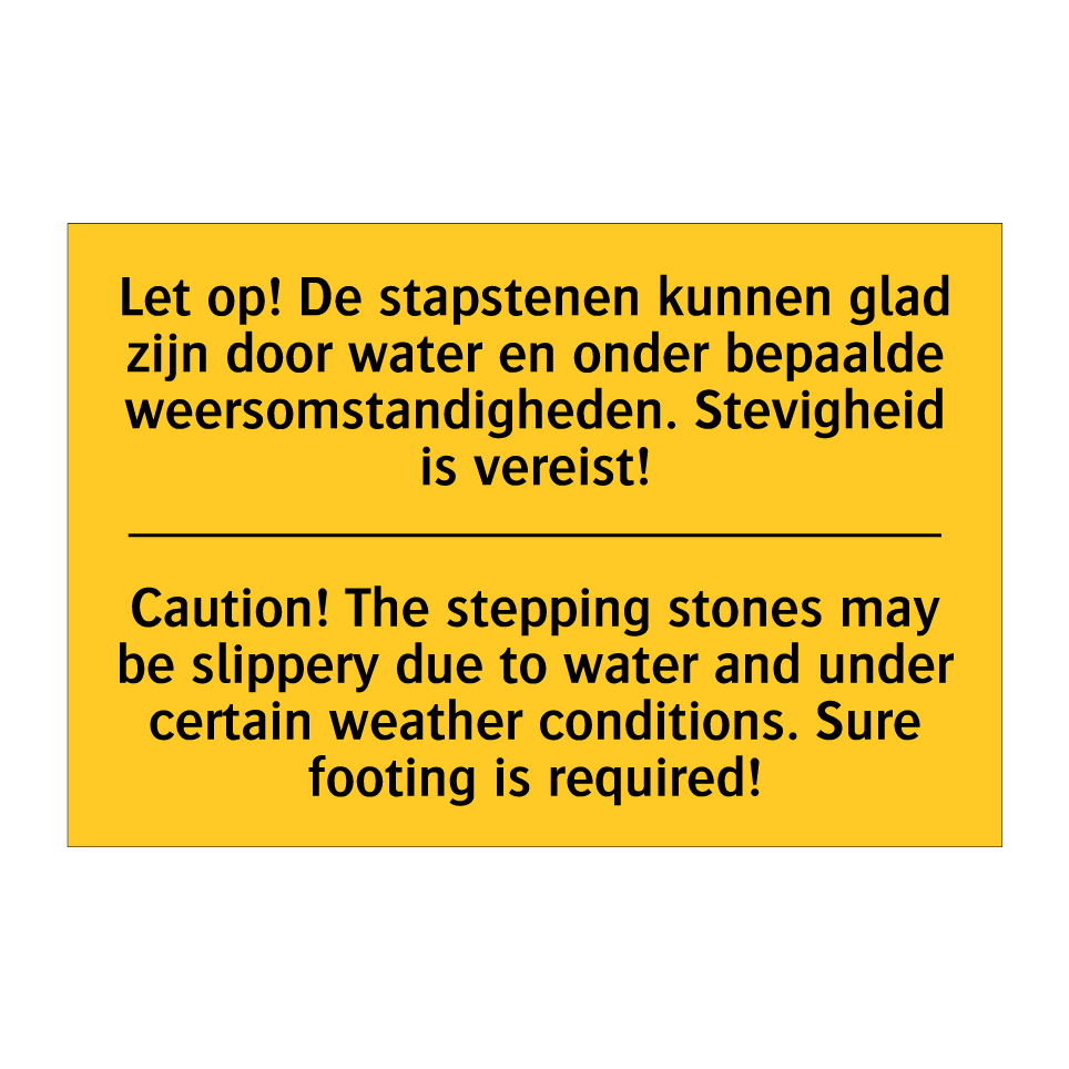 Waarschuwingsbord met de tekst Let op! De stapstenen kunnen glad zijn door water en onder bepaalde weersomstandigheden. Stevigheid is vereist! / Caution! The stepping stones may be slippery due to water and under certain weather conditions. Sure footing is required!