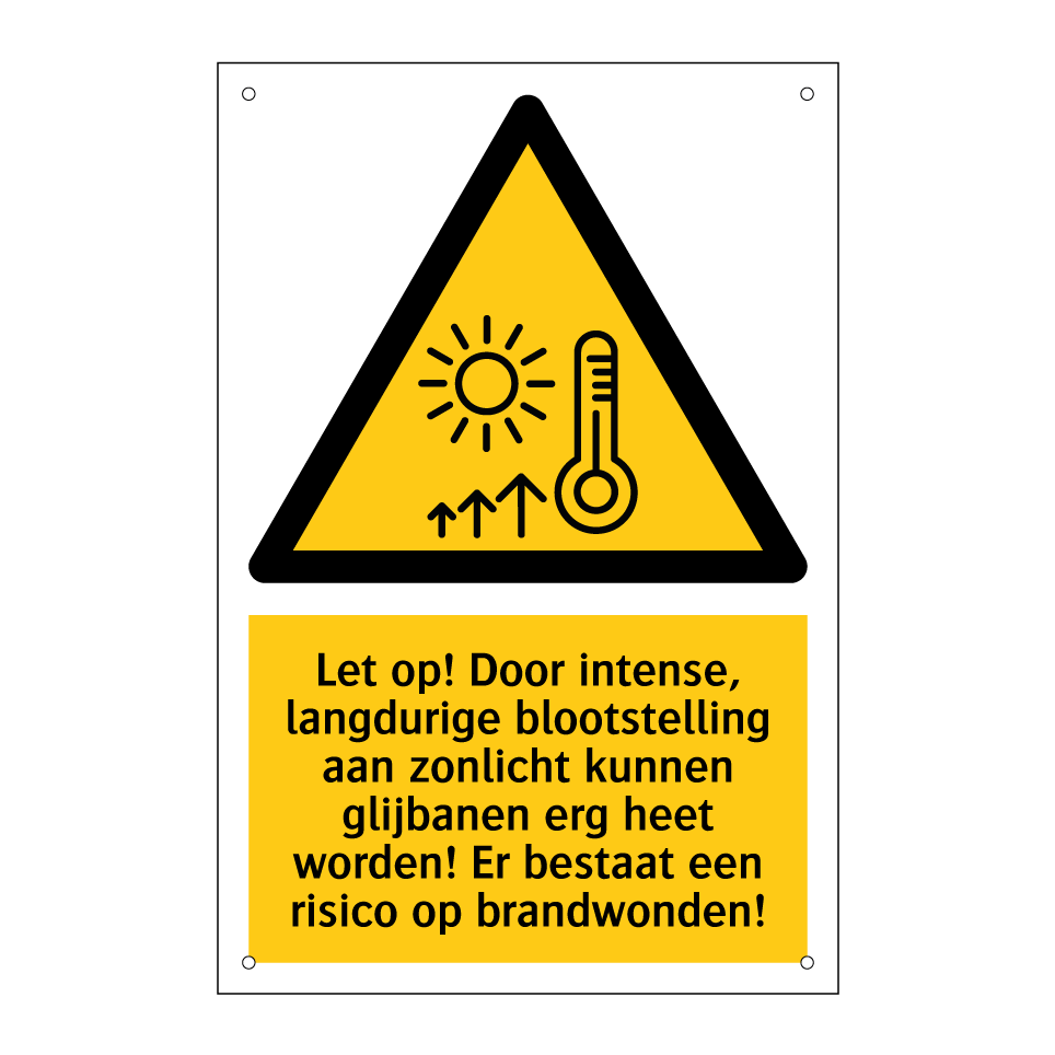 Deze waarschuwingsbord is essentieel voor speeltuinen en recreatiegebieden waar glijbanen aanwezig zijn. Het waarschuwt gebruikers voor de gevaren van langdurige blootstelling aan zonlicht, wat kan leiden tot zeer hete oppervlakken en het risico op brandwonden. Plaats deze bord op goed zichtbare locaties bij de ingang van de speeltuin of direct naast de glijbaan om ouders en kinderen te informeren en te beschermen. Dit waarschuwingsbord is een onmisbaar hulpmiddel om de veiligheid te waarborgen en ongelukken te voorkomen. Ideaal voor scholen, openbare parken en recreatiecentra.