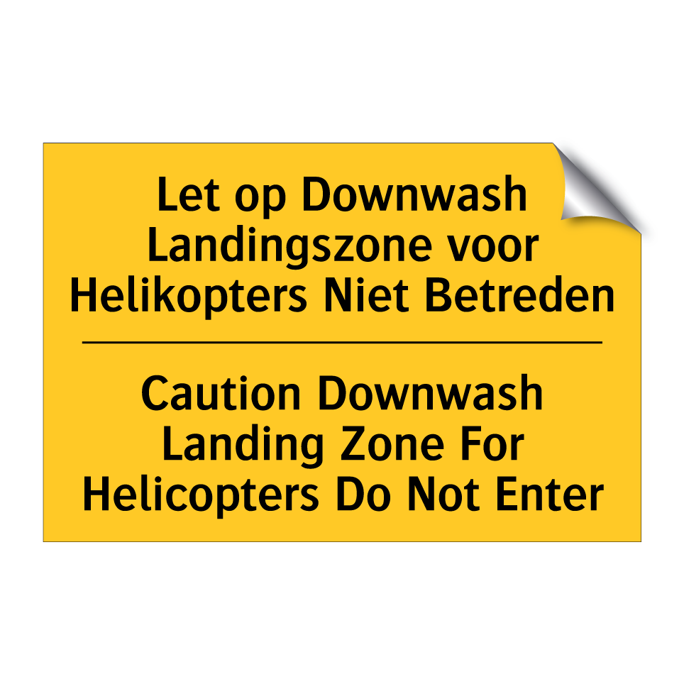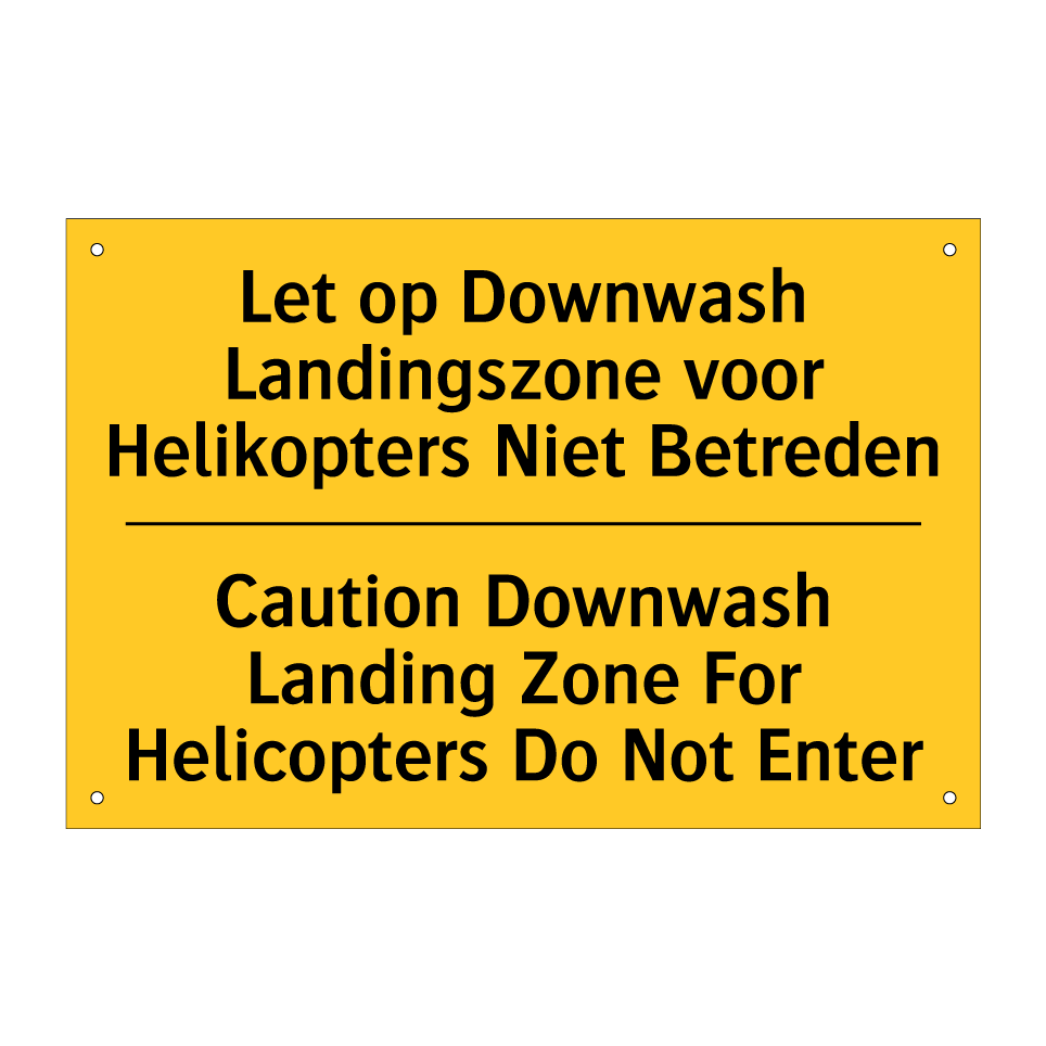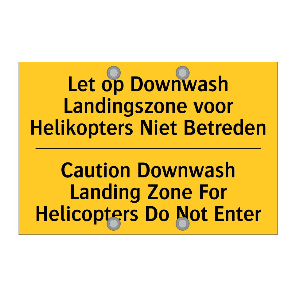 Waarschuwingsbord met de tekst Let op Downwash Landingszone voor Helikopters Niet Betreden / Caution Downwash Landing Zone For Helicopters Do Not Enter