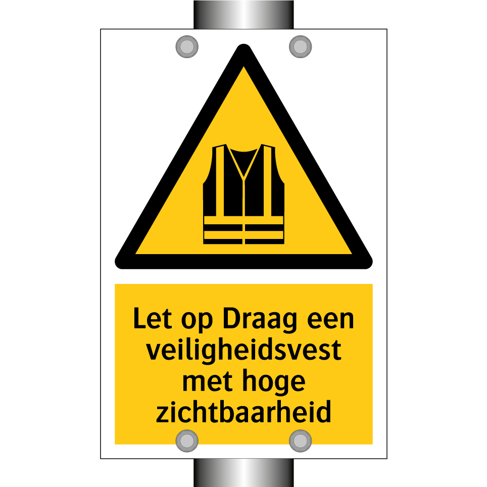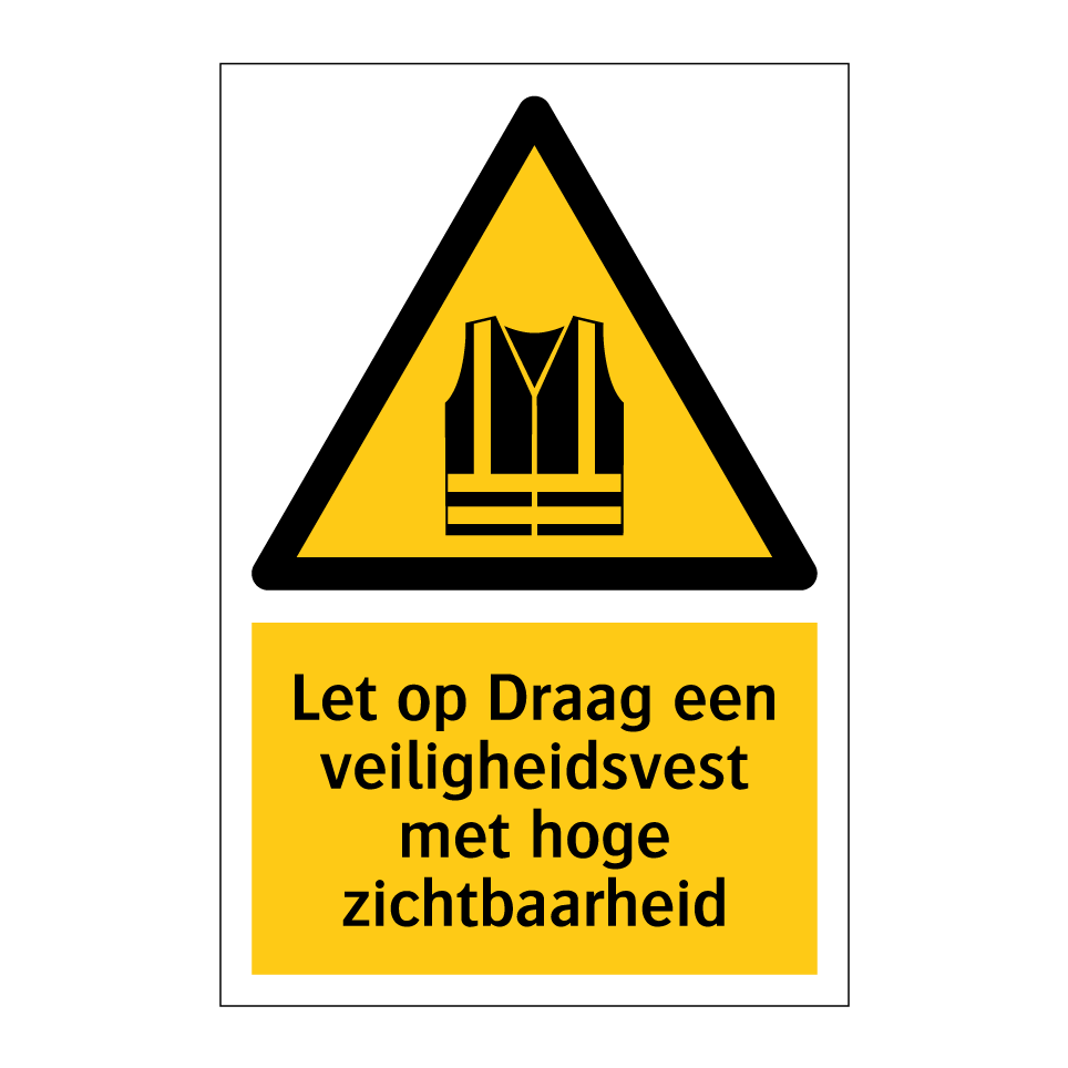 Waarschuwingsbord met de tekst Let op Draag een veiligheidsvest met hoge zichtbaarheid