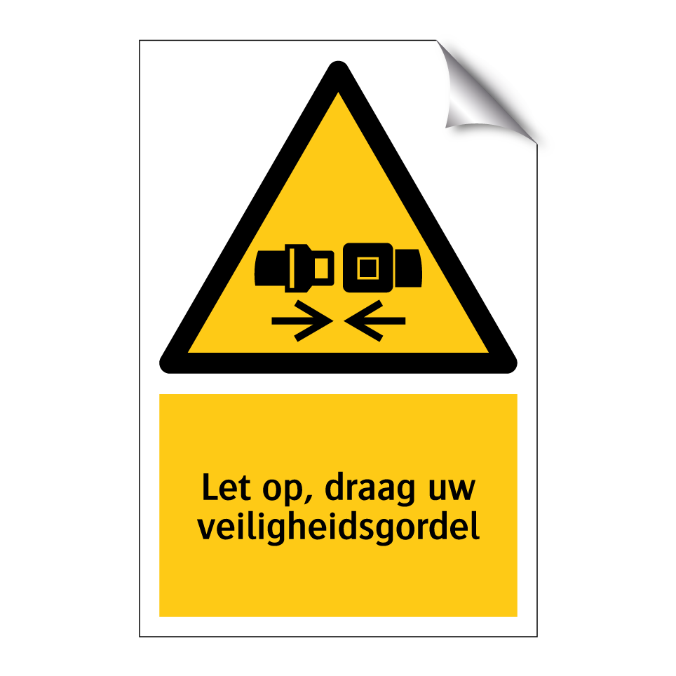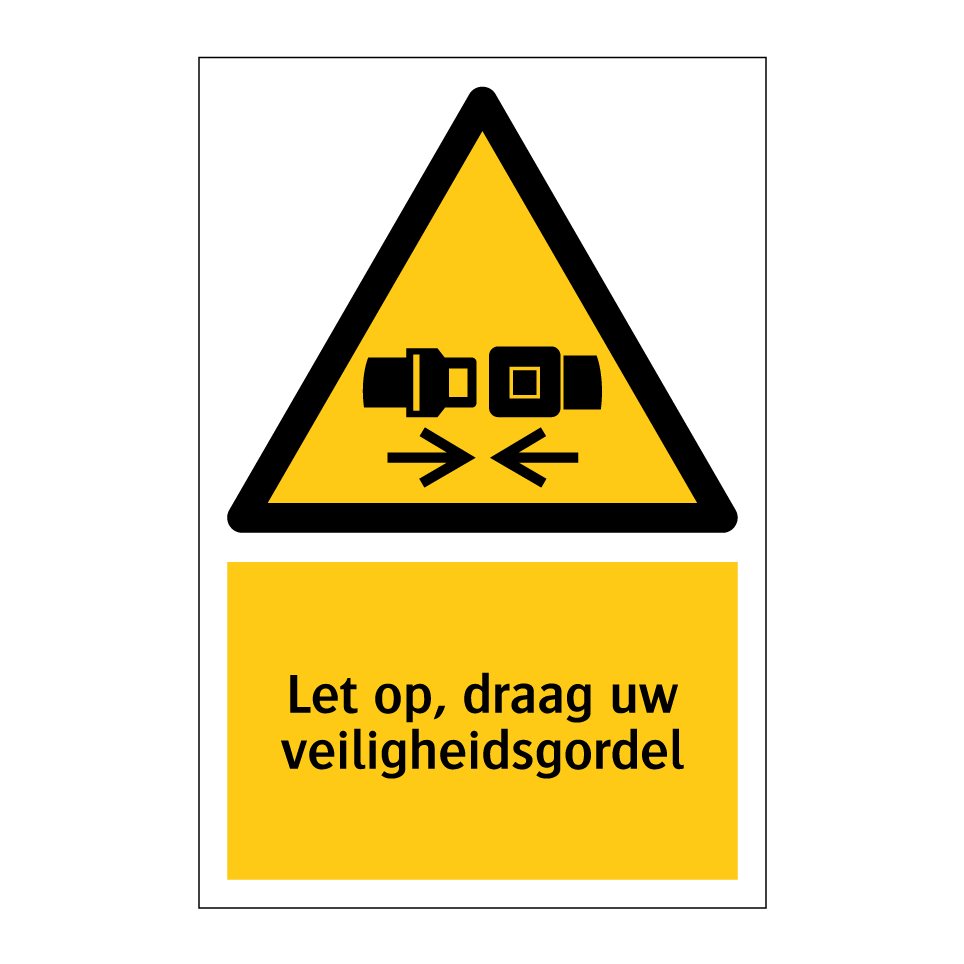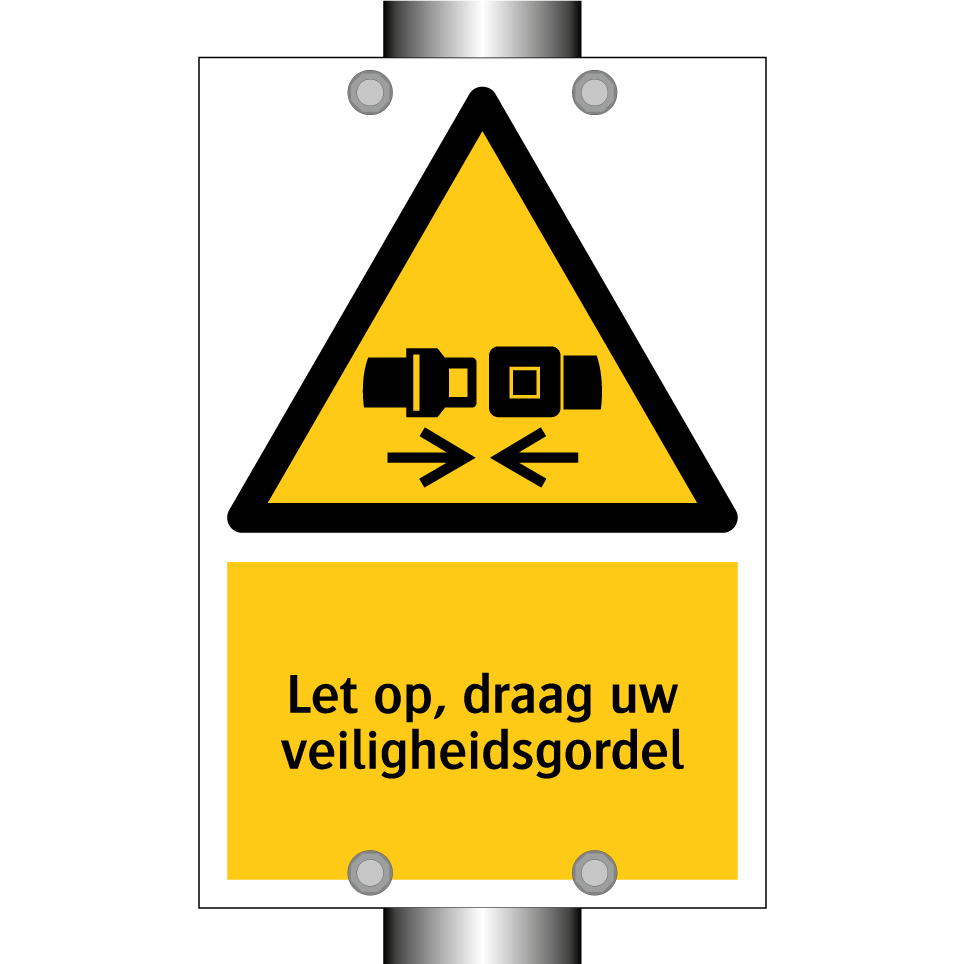 Waarschuwingsbord met de tekst Let op, draag uw veiligheidsgordel