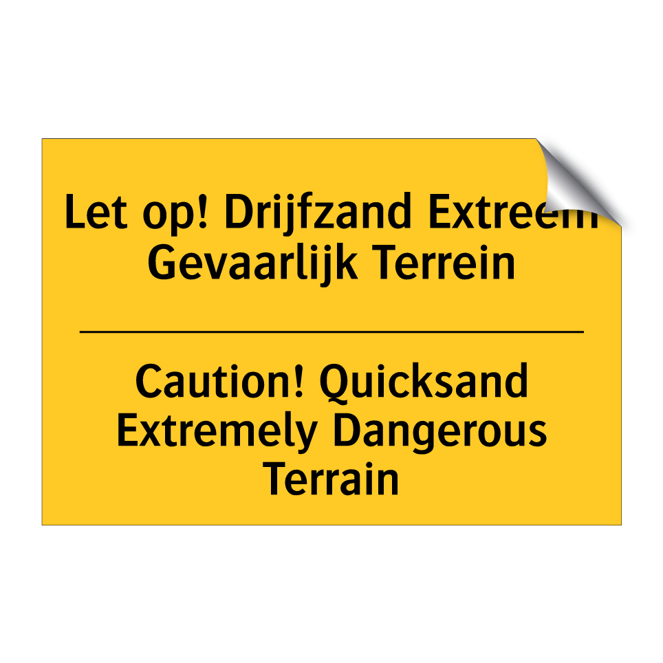 Waarschuwingsbord met de tekst Let op! Drijfzand Extreem Gevaarlijk Terrein / Caution! Quicksand Extremely Dangerous Terrain