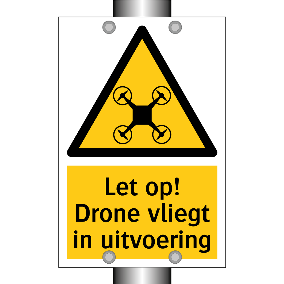 Waarschuwingsbord met de tekst Let op! Drone vliegt in uitvoering