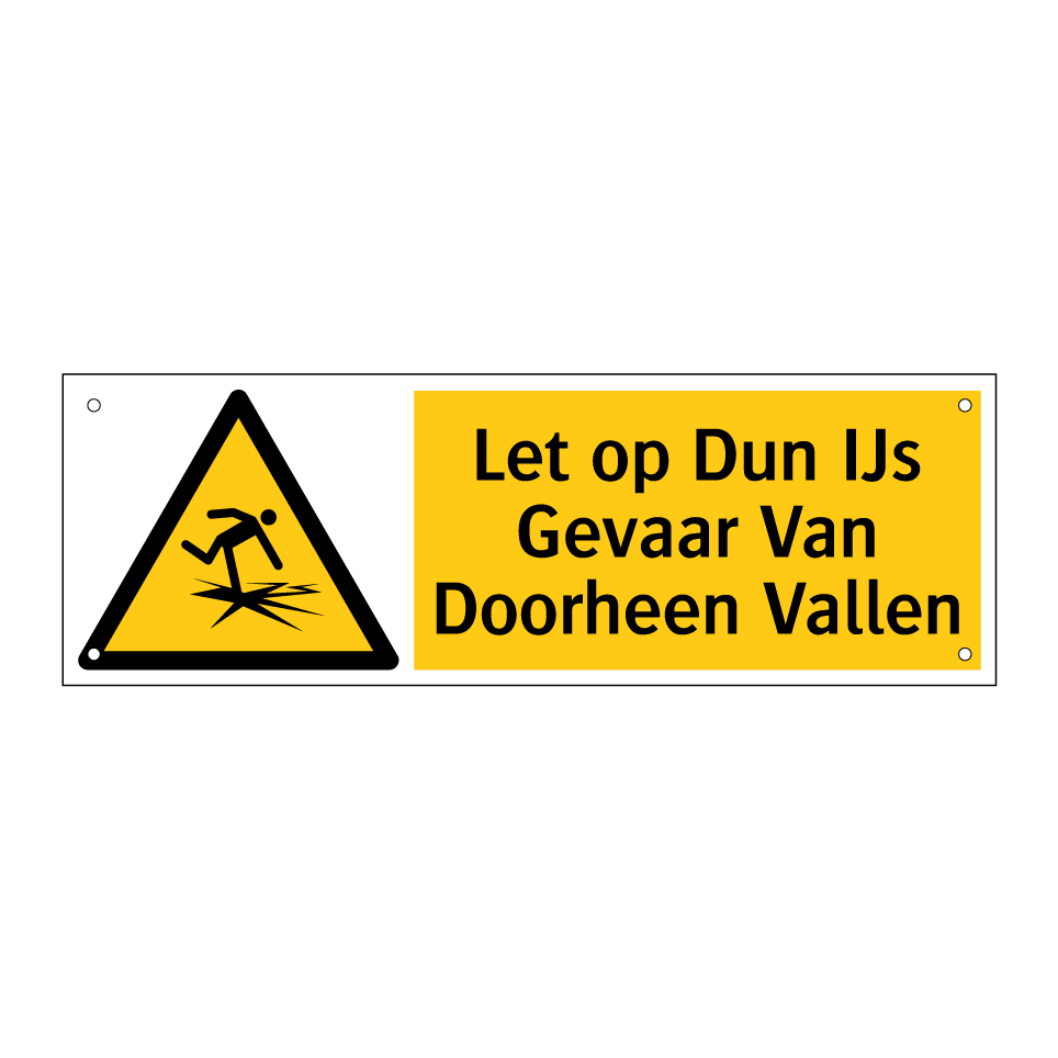Deze waarschuwingsbord is essentieel voor het markeren van gevaarlijke situaties met dun ijs. Plaats deze bord op locaties waar mensen gewaarschuwd moeten worden voor het risico van door het ijs zakken, zoals vijvers, meren en andere wateroppervlakken die in de winter bevriezen. Het waarschuwingsbord helpt ongelukken te voorkomen door duidelijk aan te geven dat het ijs onveilig is om op te lopen. Ideaal voor gebruik in parken, recreatiegebieden en privéterreinen. Zorg voor de veiligheid van bezoekers en voorbijgangers door hen te waarschuwen voor het gevaar van dun ijs.