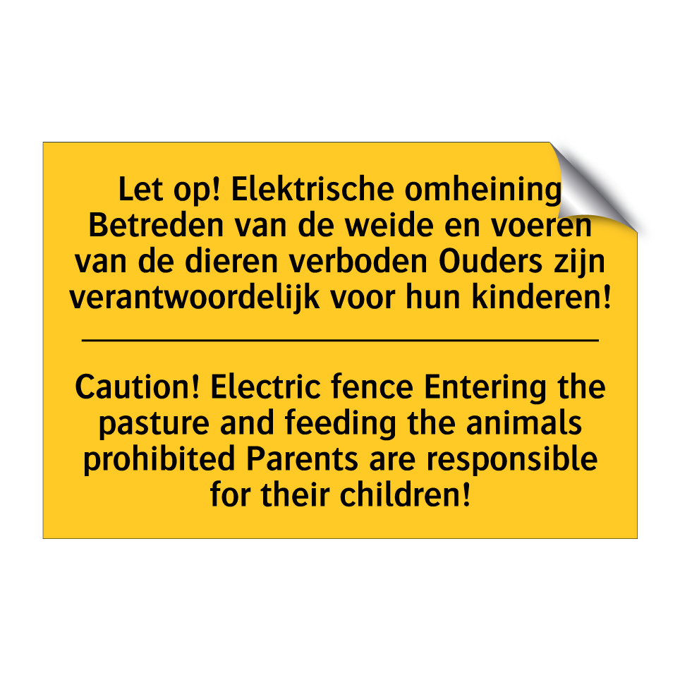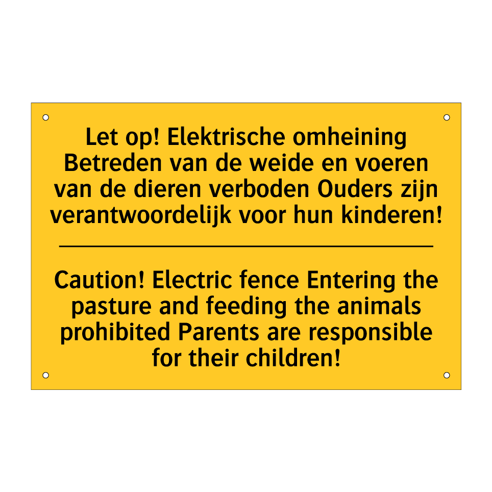 Waarschuwingsbord met de tekst Let op! Elektrische omheining Betreden van de weide en voeren van de dieren verboden Ouders zijn verantwoordelijk voor hun kinderen! / Caution! Electric fence Entering the pasture and feeding the animals prohibited Parents are responsible for their children!