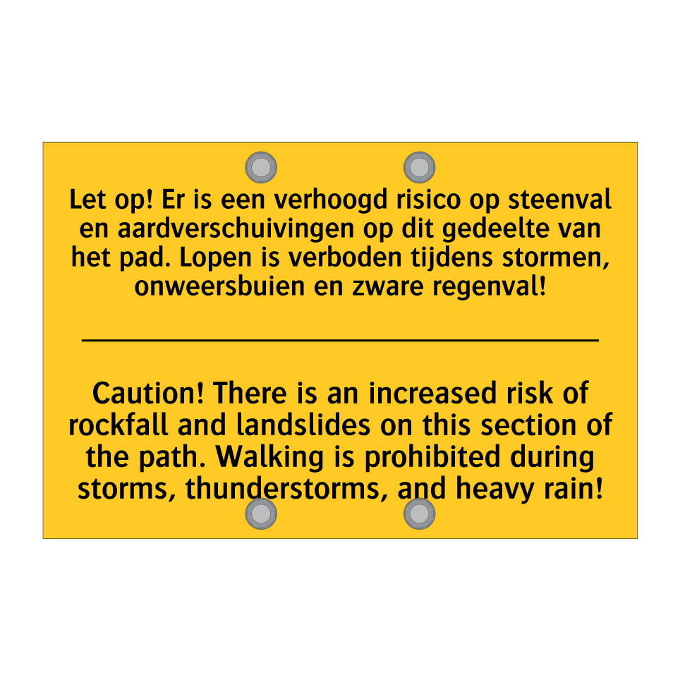 Waarschuwingsbord met de tekst Let op! Er is een verhoogd risico op steenval en aardverschuivingen op dit gedeelte van het pad. Lopen is verboden tijdens stormen, onweersbuien en zware regenval! / Caution! There is an increased risk of rockfall and landslides on this section of the path. Walking is prohibited during storms, thunderstorms, and heavy rain!