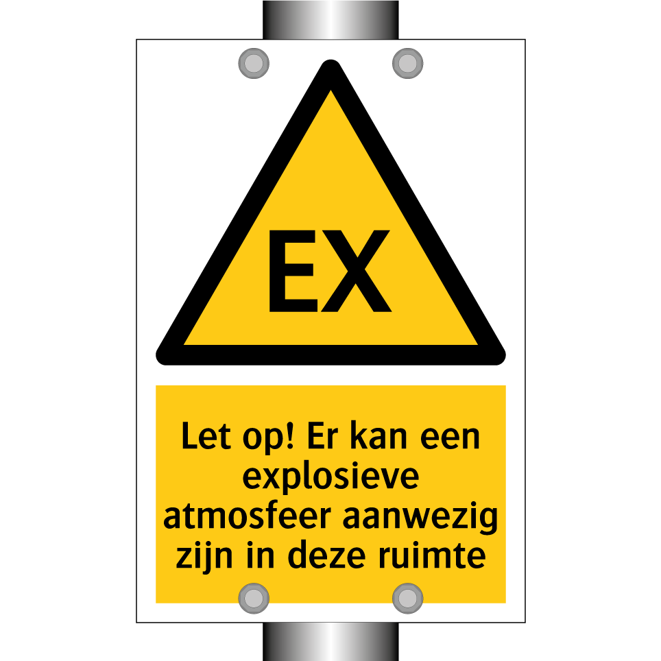 Waarschuwingsbord met de tekst Let op! Er kan een explosieve atmosfeer aanwezig zijn in deze ruimte