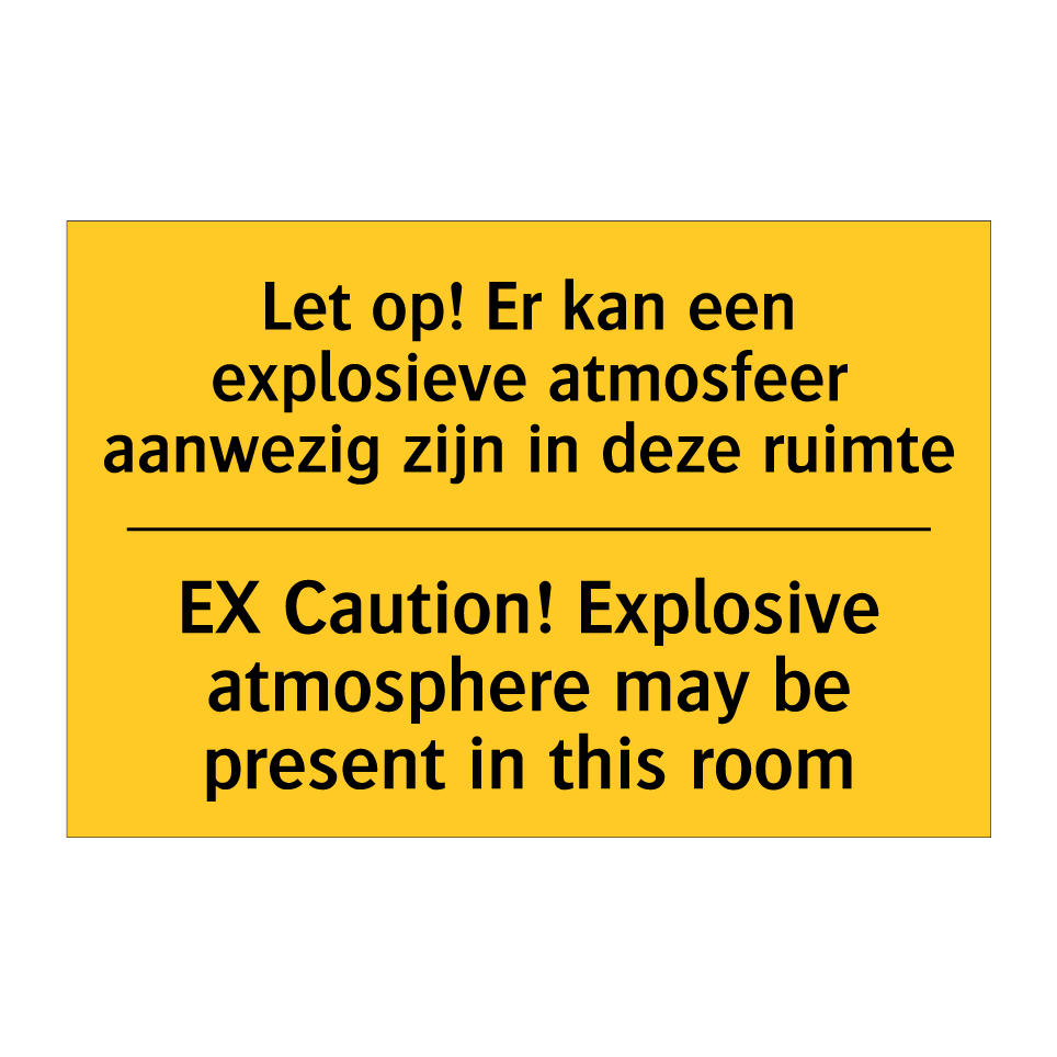 Waarschuwingsbord met de tekst Let op! Er kan een explosieve atmosfeer aanwezig zijn in deze ruimte / EX Caution! Explosive atmosphere may be present in this room
