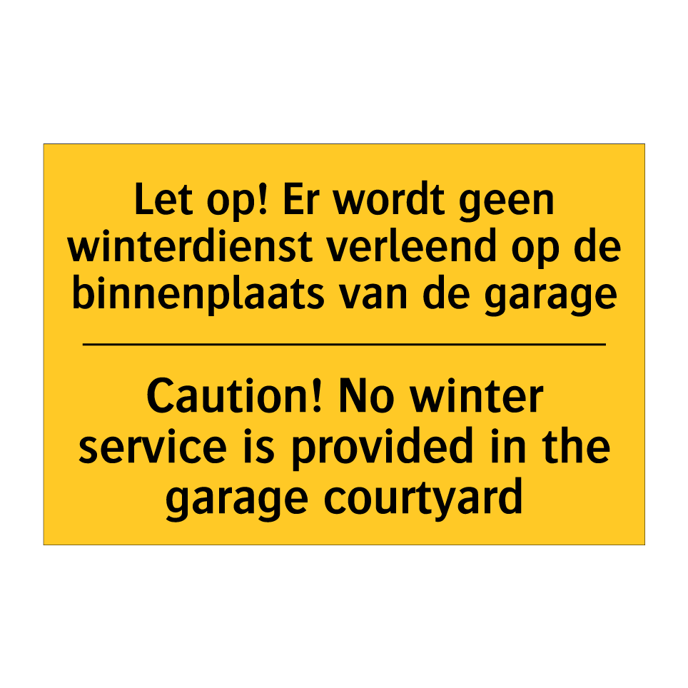 Waarschuwingsbord met de tekst Let op! Er wordt geen winterdienst verleend op de binnenplaats van de garage / Caution! No winter service is provided in the garage courtyard