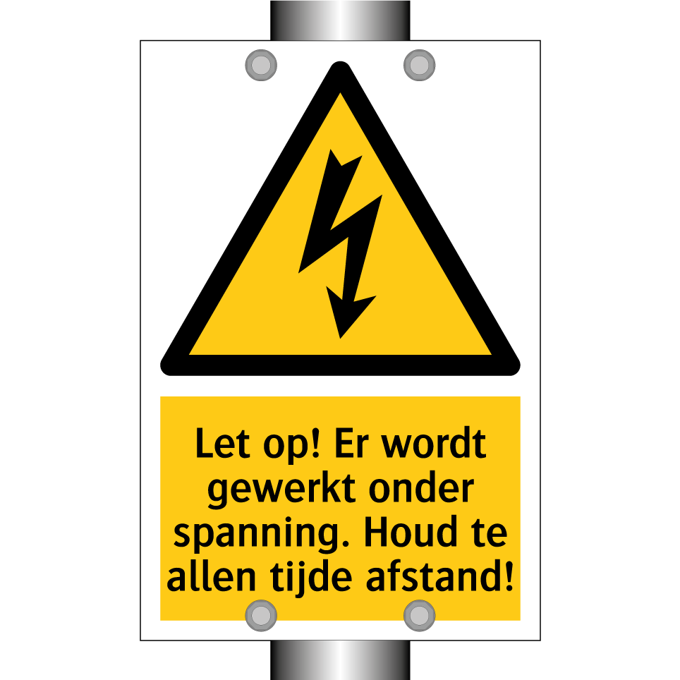 Waarschuwingsbord met de tekst Let op! Er wordt gewerkt onder spanning. Houd te allen tijde afstand!