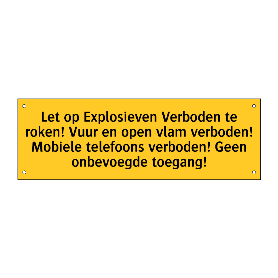Waarschuwingsbord met de tekst Let op Explosieven Verboden te roken! Vuur en open vlam verboden! Mobiele telefoons verboden! Geen onbevoegde toegang!