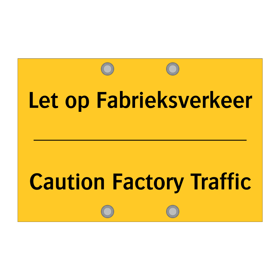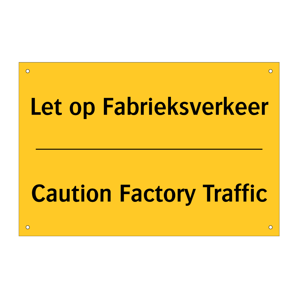 Waarschuwingsbord met de tekst Let op Fabrieksverkeer / Caution Factory Traffic