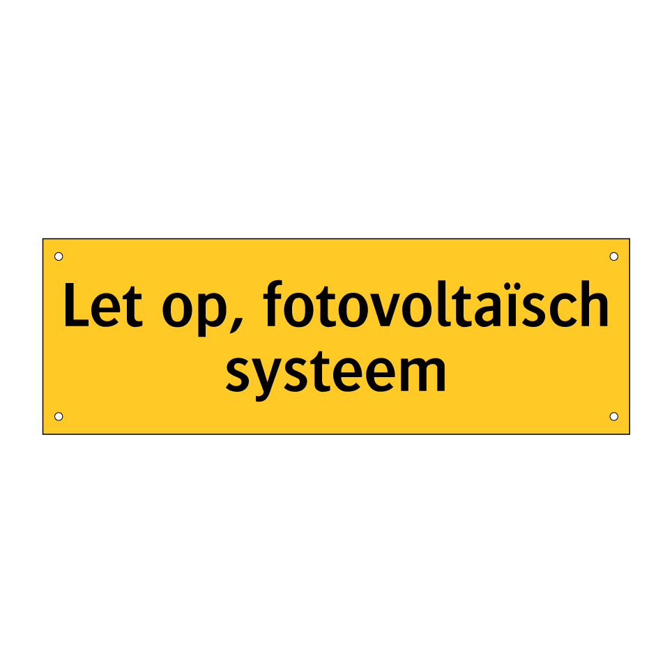 Waarschuwingsbord met de tekst Let op, fotovoltaïsch systeem