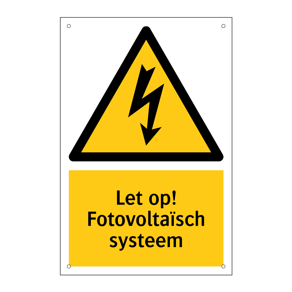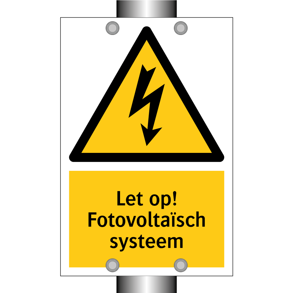 Waarschuwingsbord met de tekst Let op! Fotovoltaïsch systeem