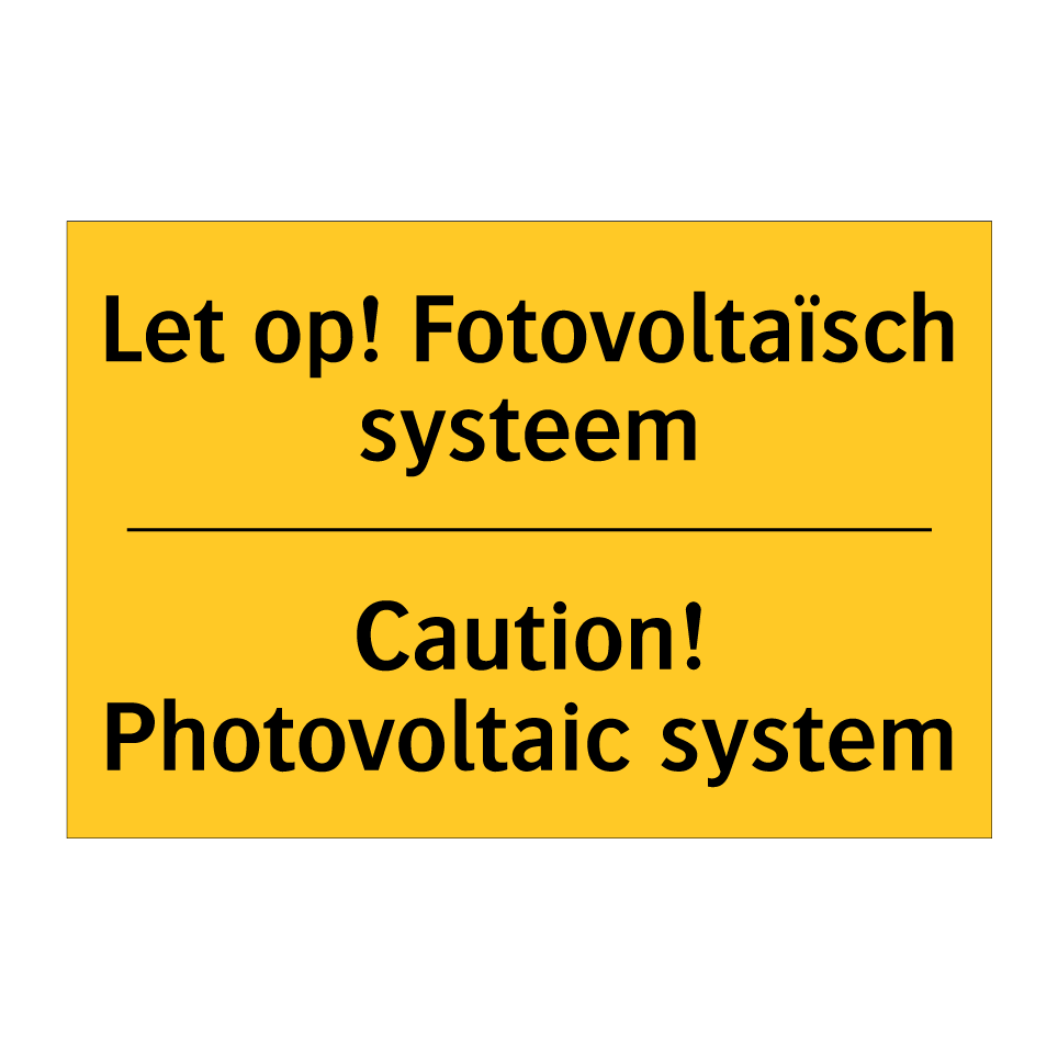 Waarschuwingsbord met de tekst Let op! Fotovoltaïsch systeem / Caution! Photovoltaic system