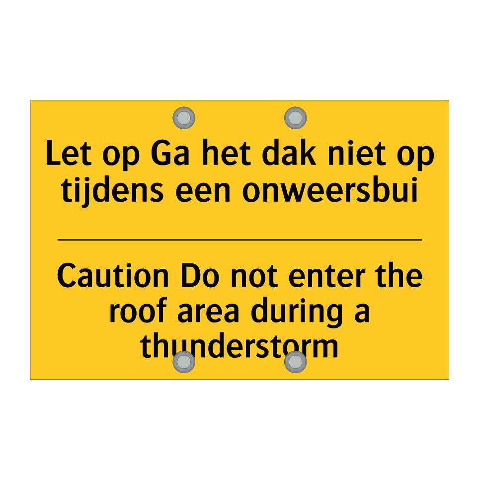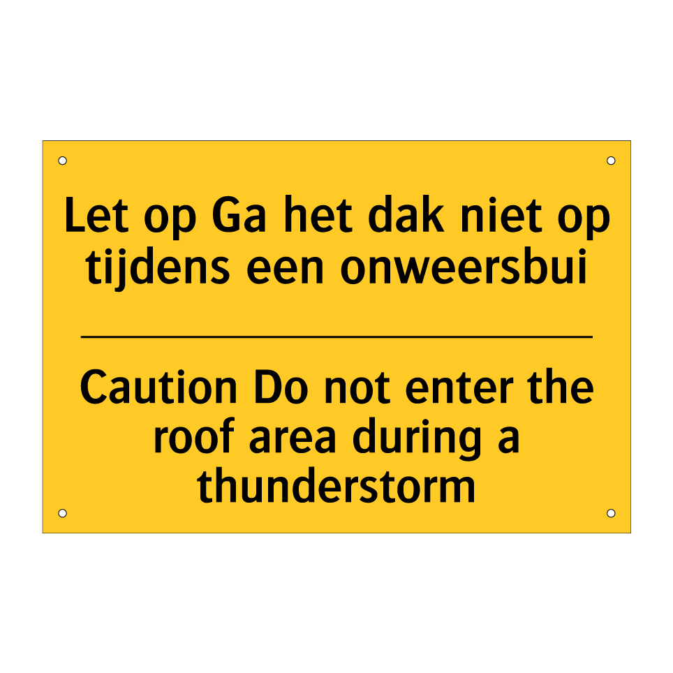 Waarschuwingsbord met de tekst Let op Ga het dak niet op tijdens een onweersbui / Caution Do not enter the roof area during a thunderstorm