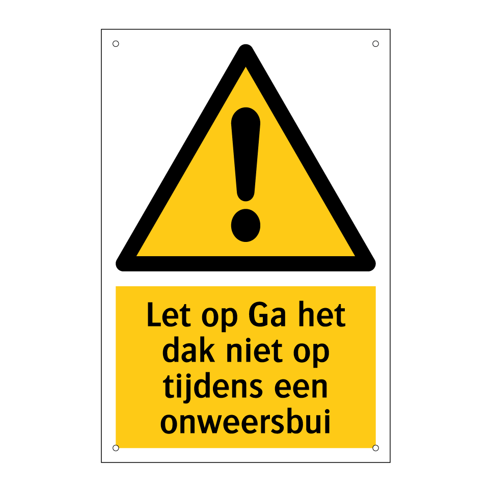 Waarschuwingsbord met de tekst Let op Ga het dak niet op tijdens een onweersbui