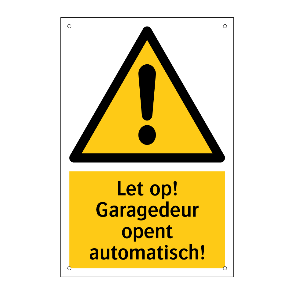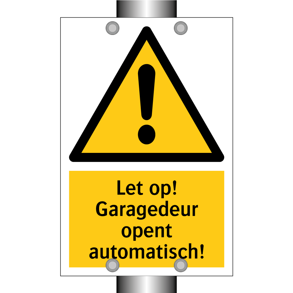 Waarschuwingsbord met de tekst Let op! Garagedeur opent automatisch!