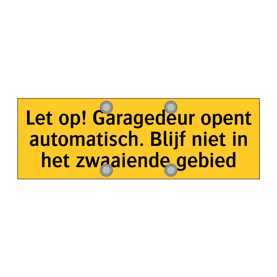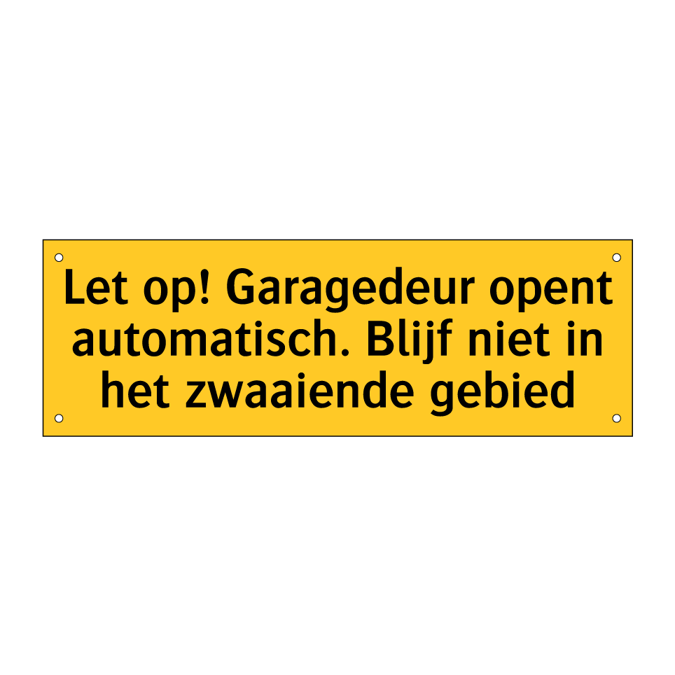 Waarschuwingsbord met de tekst Let op! Garagedeur opent automatisch. Blijf niet in het zwaaiende gebied