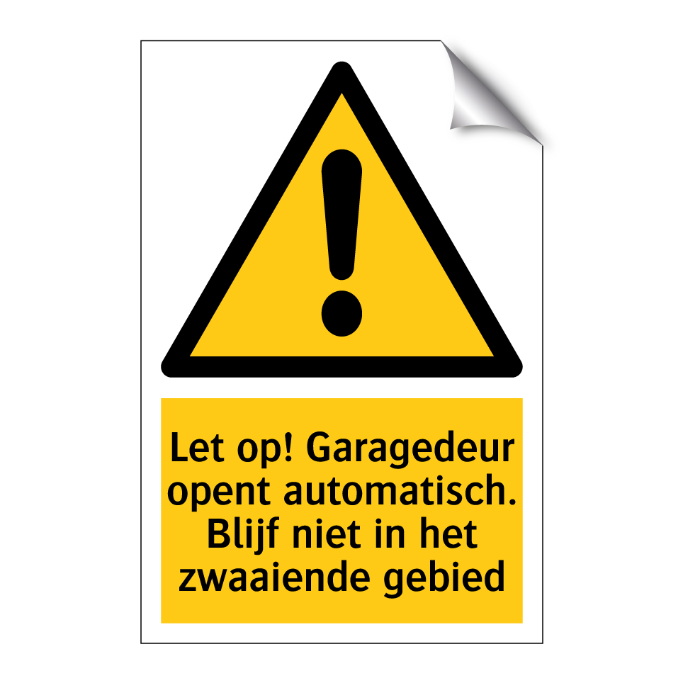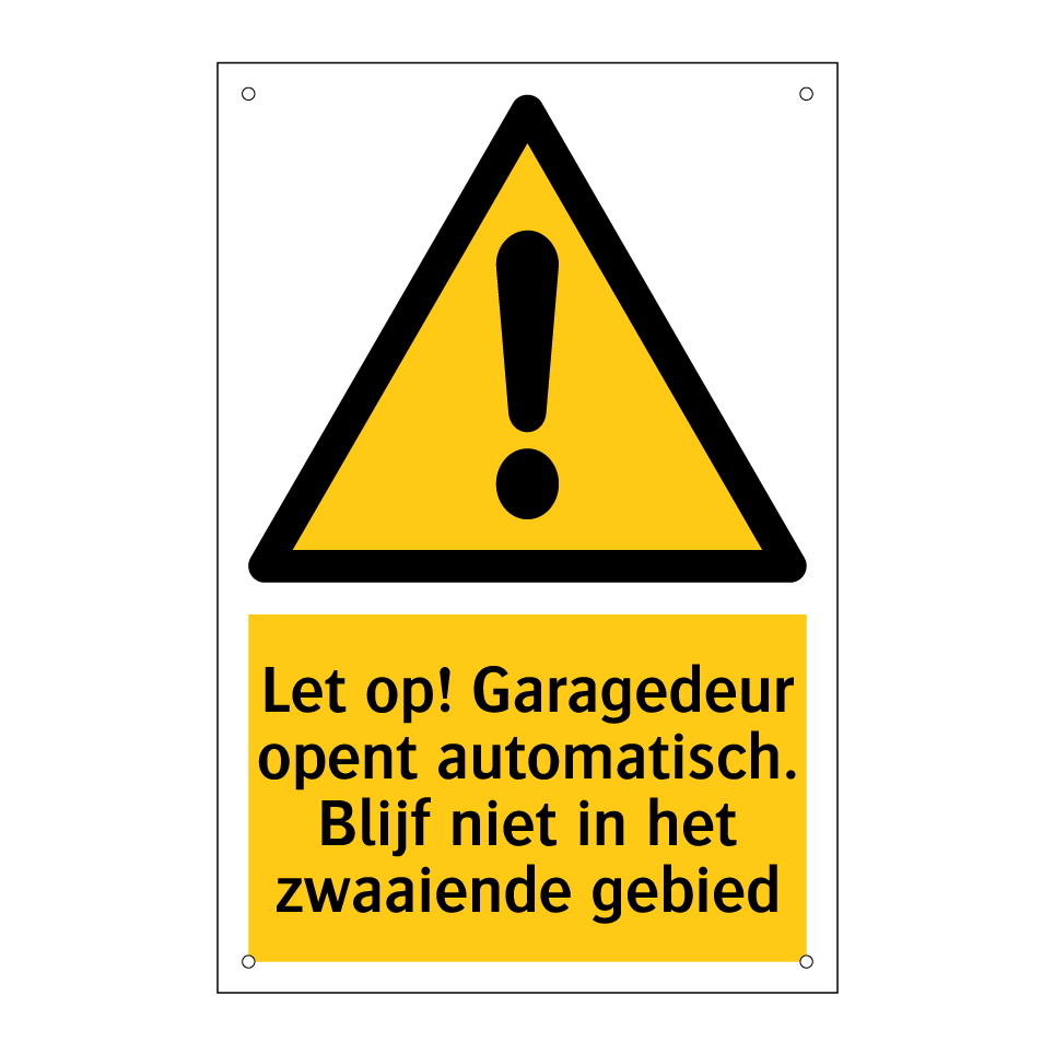 Waarschuwingsbord met de tekst Let op! Garagedeur opent automatisch. Blijf niet in het zwaaiende gebied