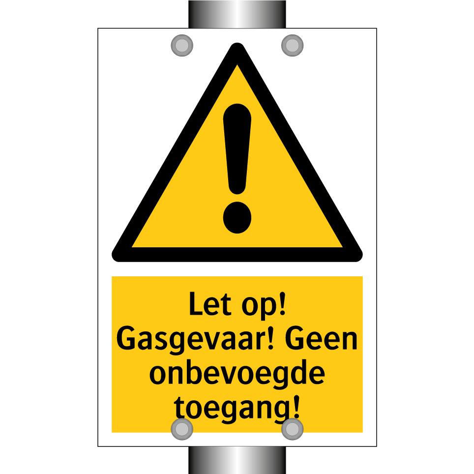 Waarschuwingsbord met de tekst Let op! Gasgevaar! Geen onbevoegde toegang!