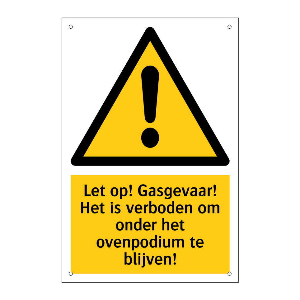 Waarschuwingsbord met de tekst Let op! Gasgevaar! Het is verboden om onder het ovenpodium te blijven!