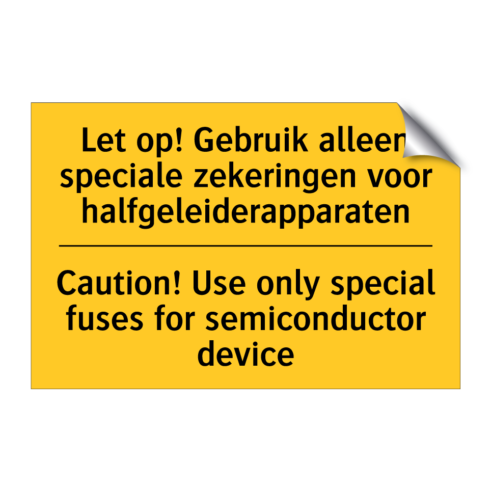 Waarschuwingsbord met de tekst Let op! Gebruik alleen speciale zekeringen voor halfgeleiderapparaten / Caution! Use only special fuses for semiconductor device