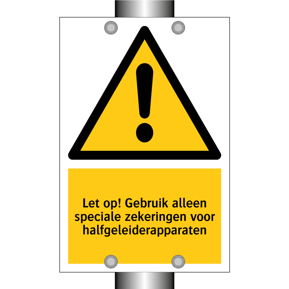 Waarschuwingsbord met de tekst Let op! Gebruik alleen speciale zekeringen voor halfgeleiderapparaten