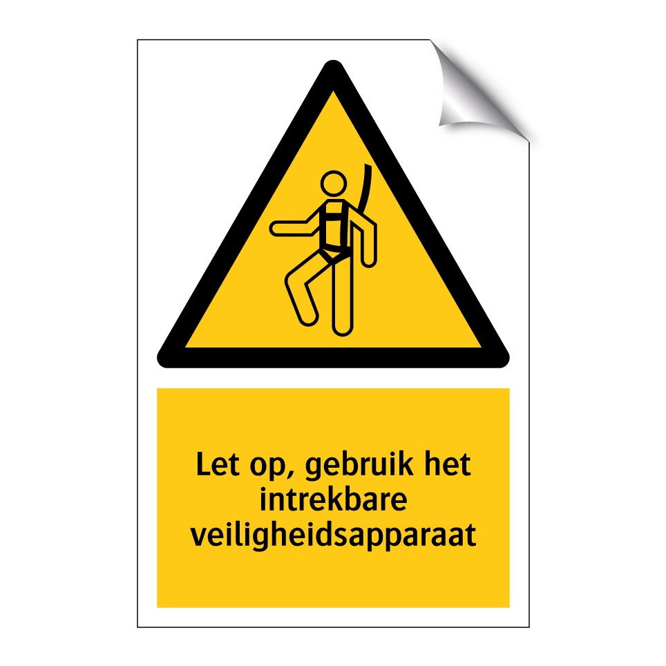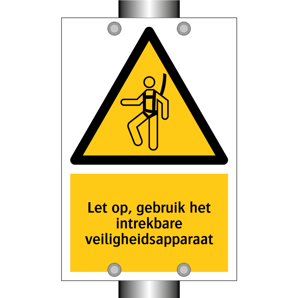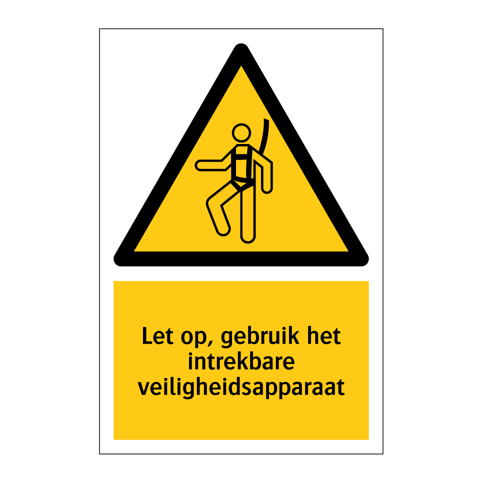 Waarschuwingsbord met de tekst Let op, gebruik het intrekbare veiligheidsapparaat