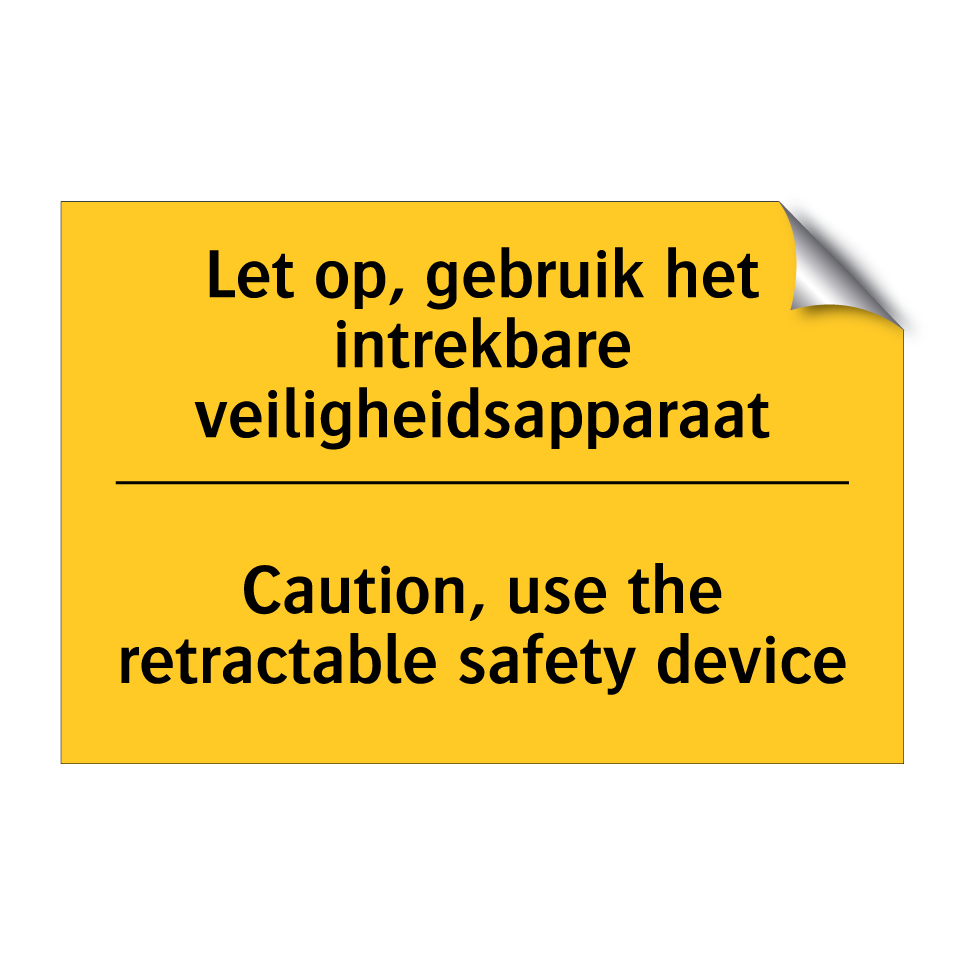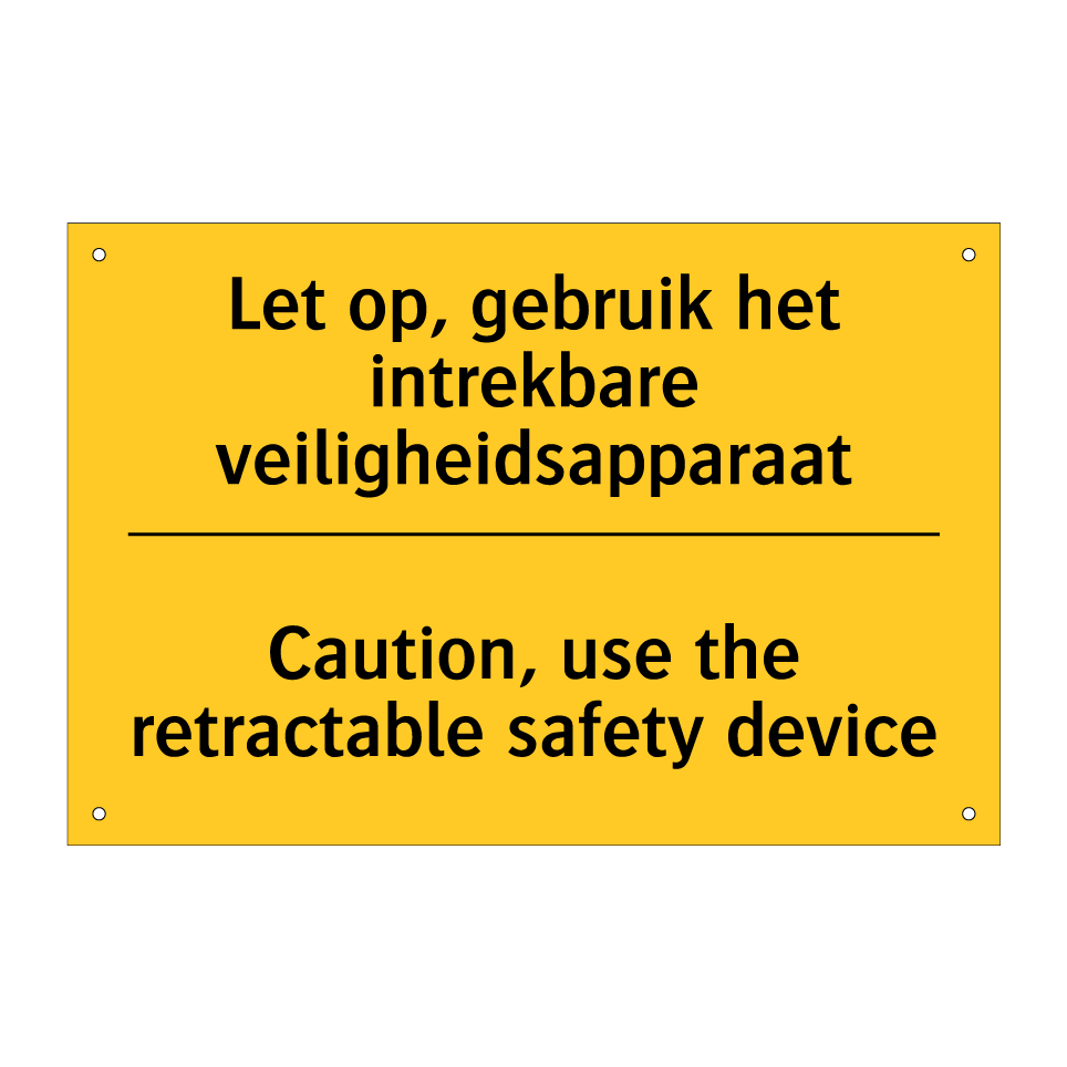 Waarschuwingsbord met de tekst Let op, gebruik het intrekbare veiligheidsapparaat / Caution, use the retractable safety device