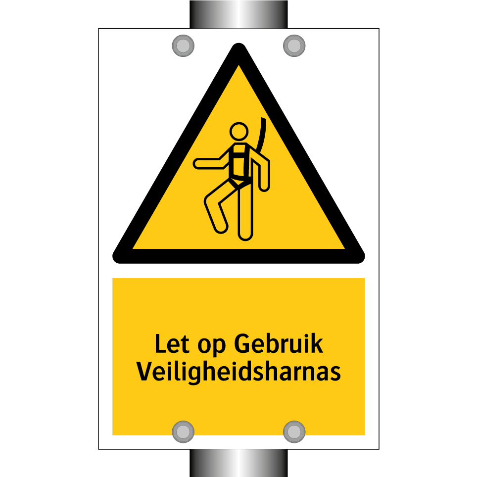 Waarschuwingsbord met de tekst Let op Gebruik Veiligheidsharnas